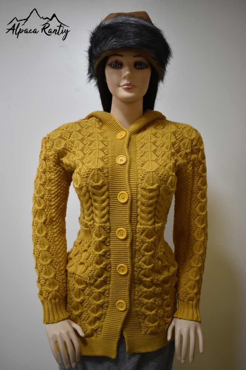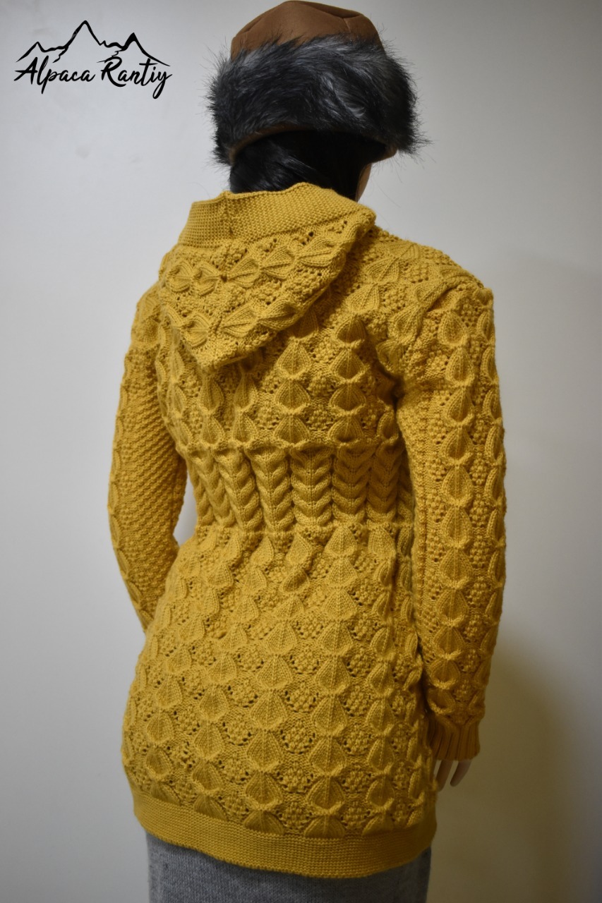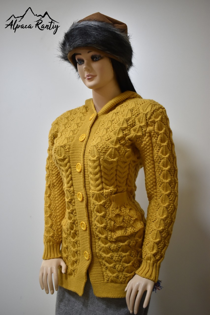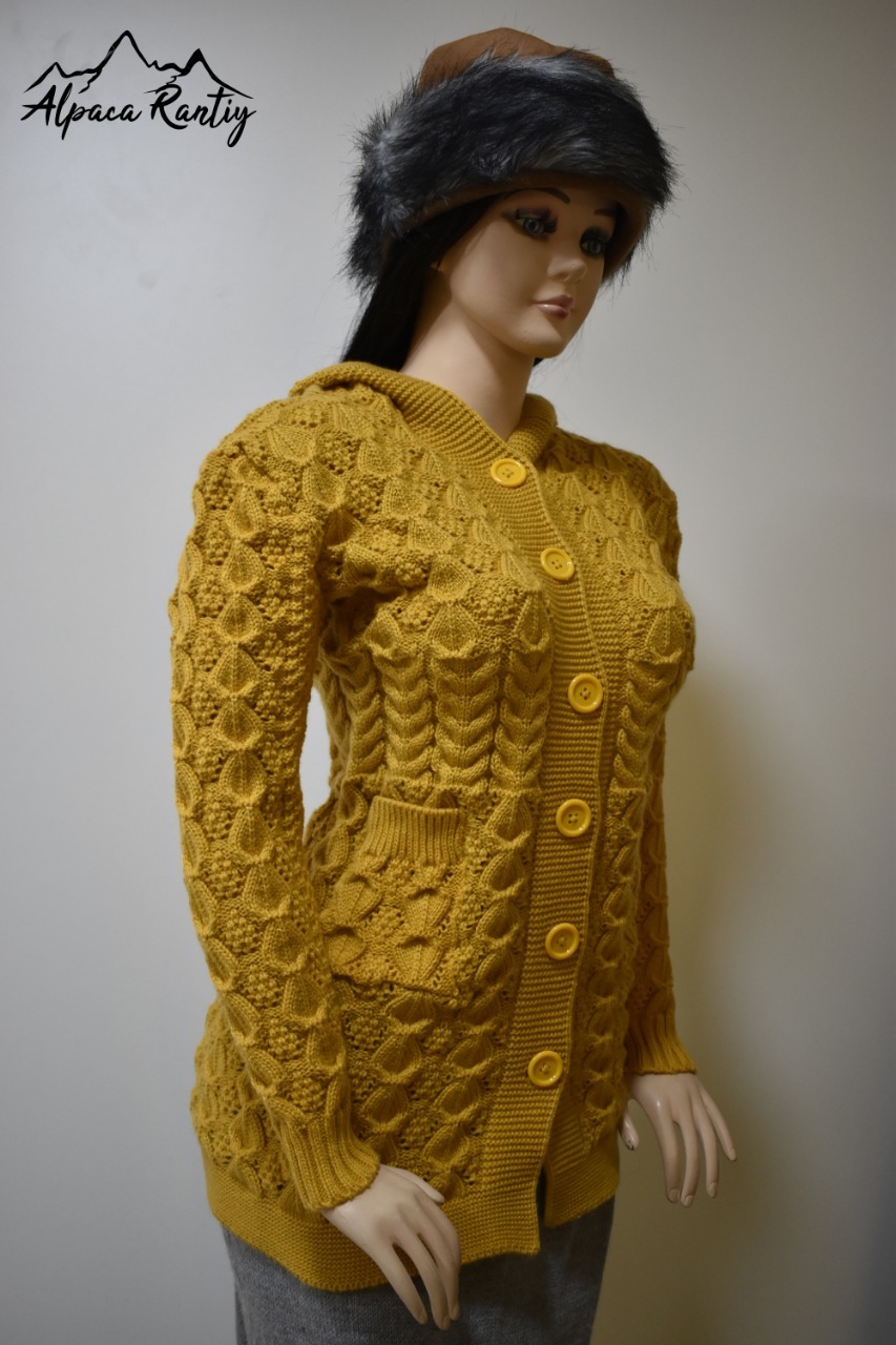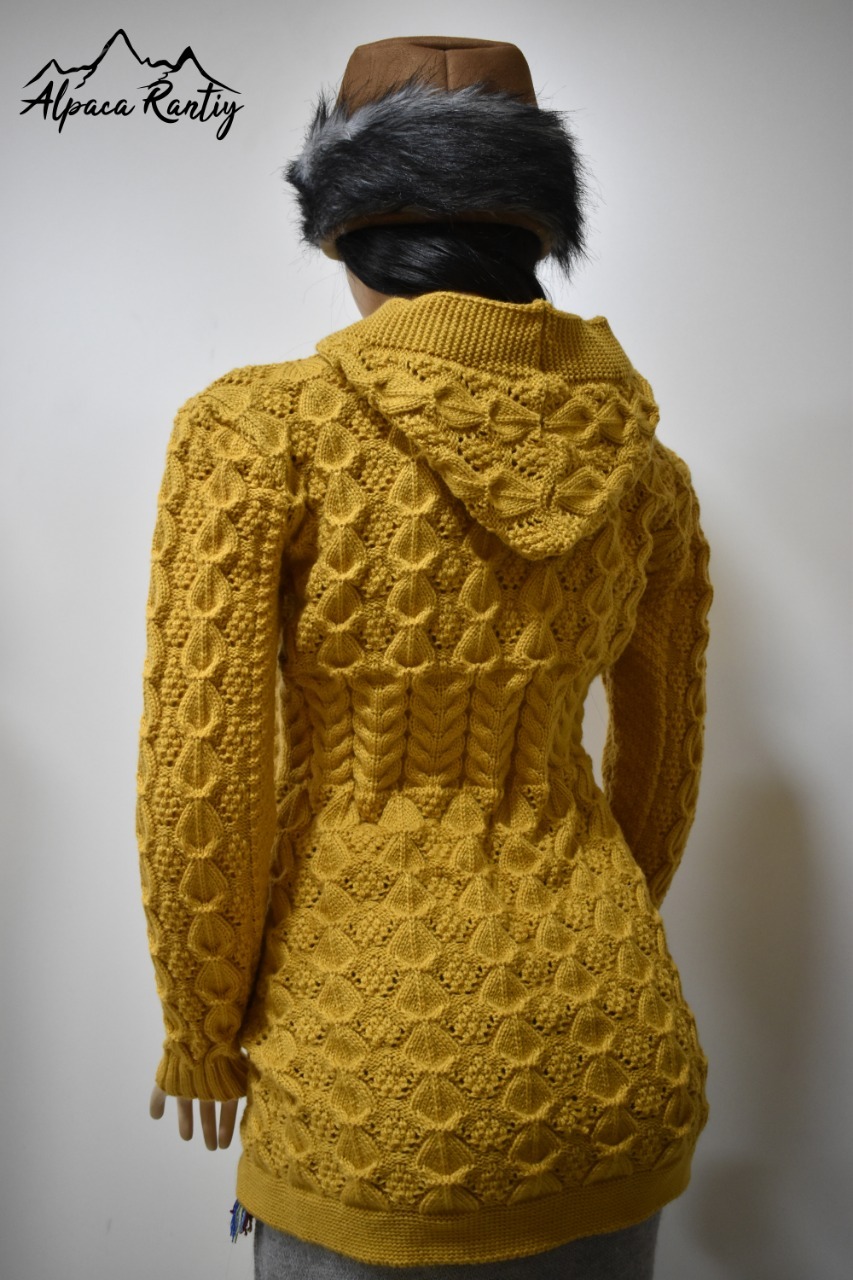 Luce y siéntete abrigada con esta hermosa chompa, ideal para los días fríos. Confeccionada con tejido de punto grueso y diseño en relieve que combina trenzas y figuras geométricas, le da un estilo único y elegante.