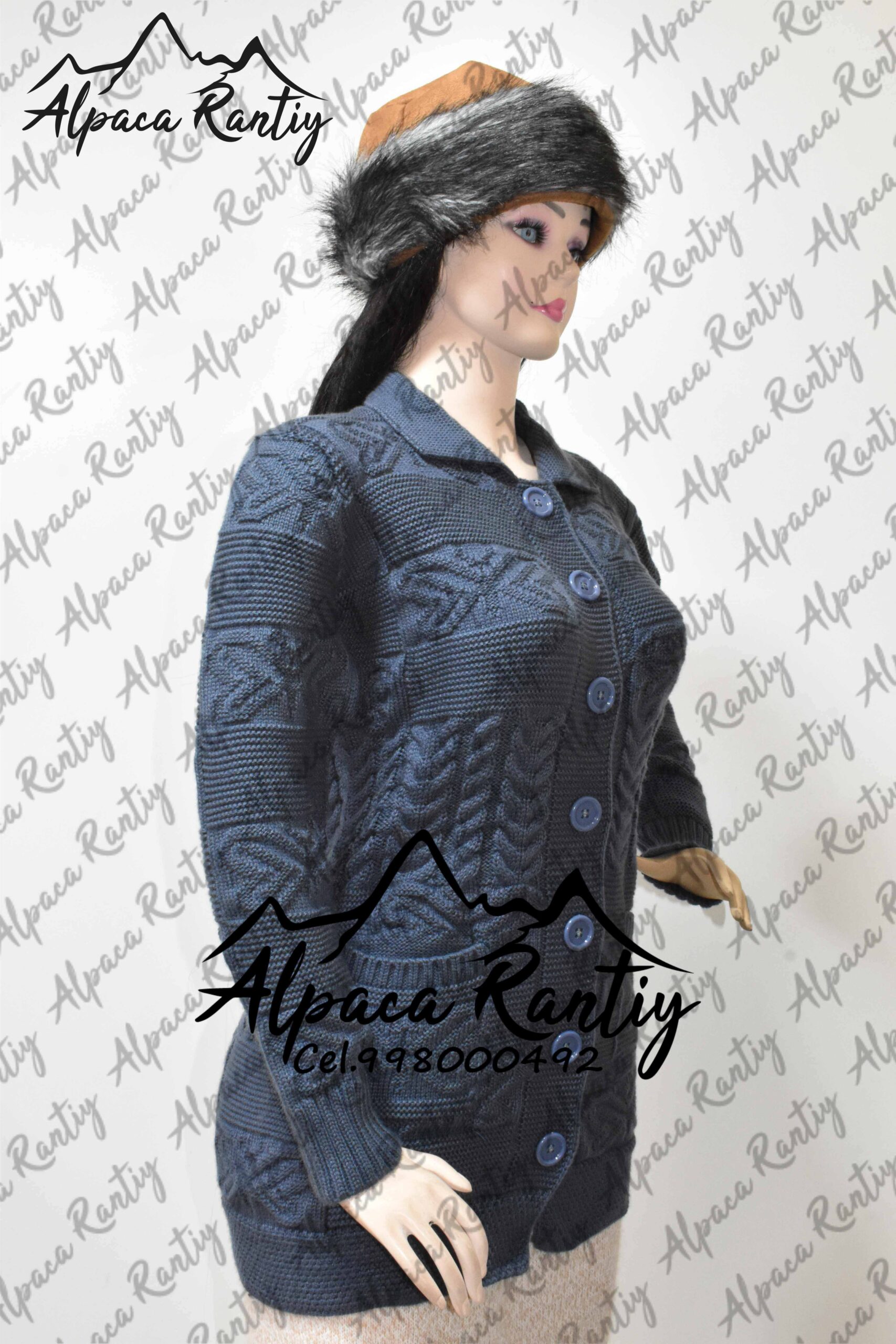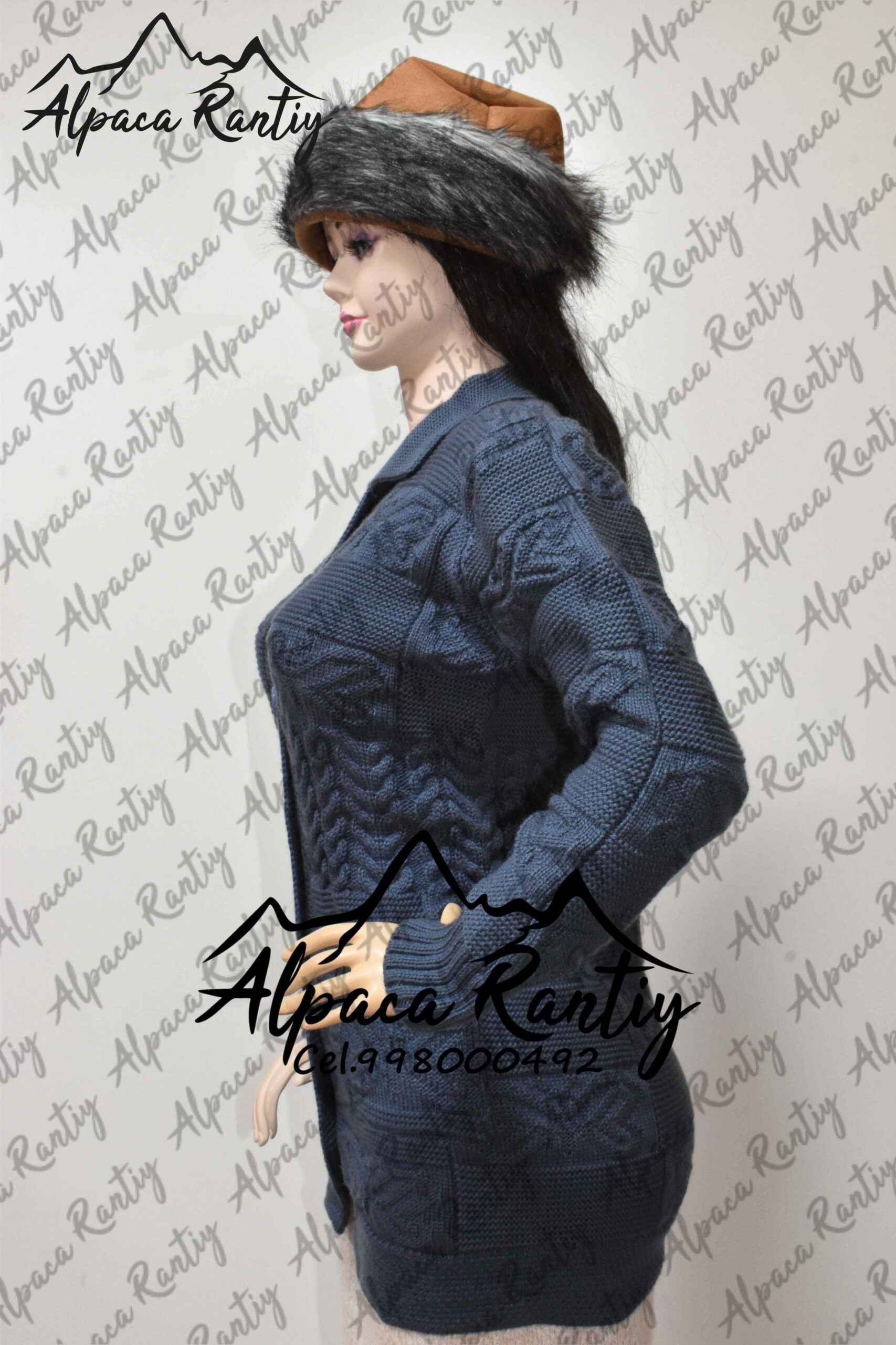 Hermosa chompa tejida para dama, confeccionada con fibra suave y abrigadora. Su diseño presenta un elegante cuello camisero, botones frontales y un tejido con relieves trenzados y figuras decorativas que resaltan el arte del tejido artesanal andino.