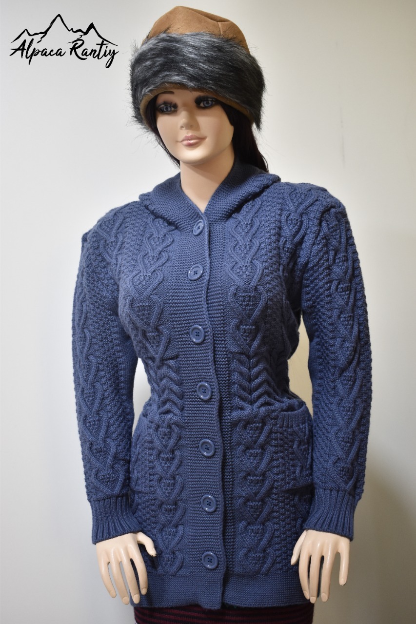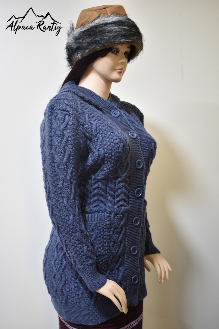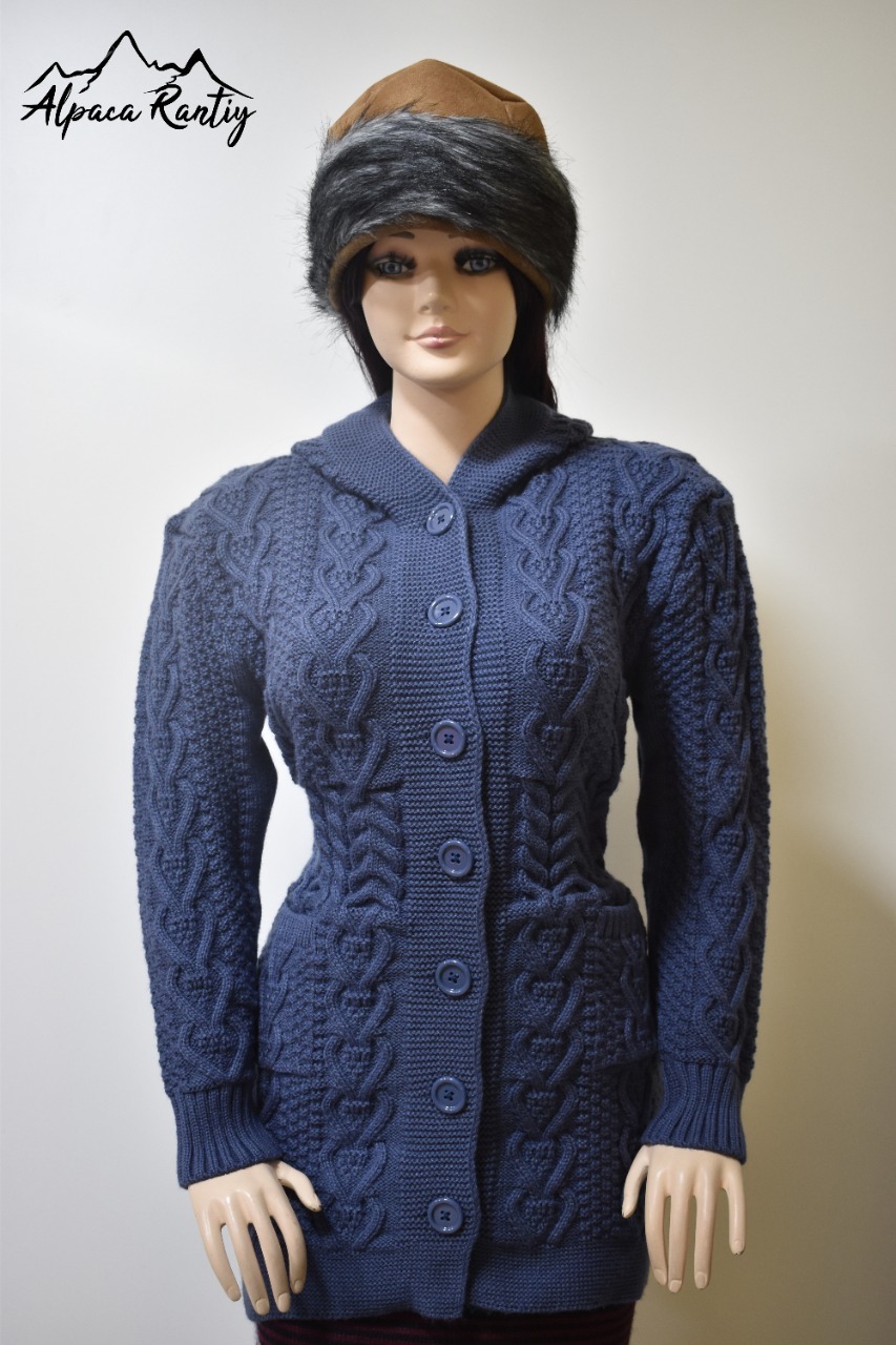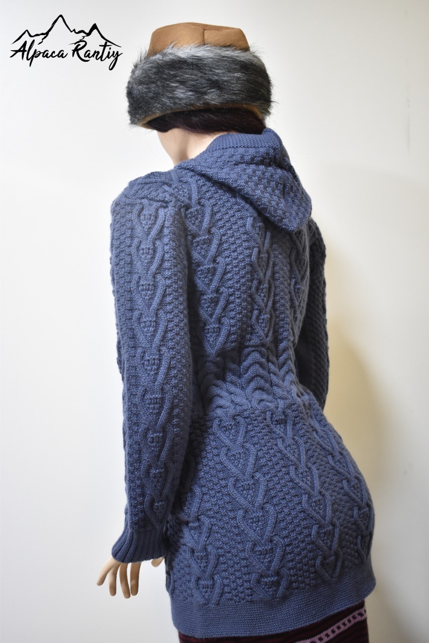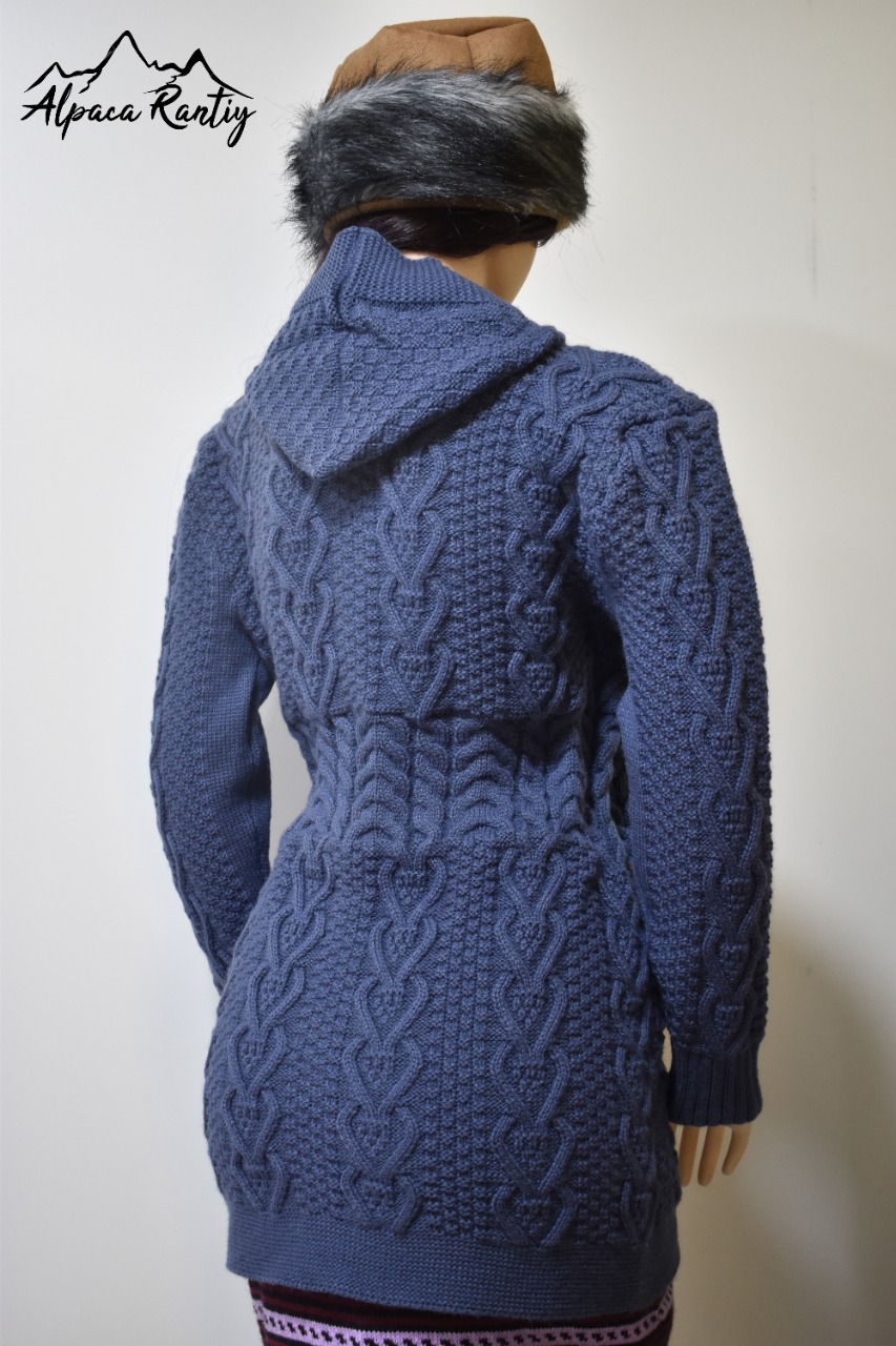 Dale un toque de distinción a tus días fríos con esta chompa larga, confeccionada con tejido en material Wayra de alta calidad. Su diseño con relieves de corazones y trenzas aporta un estilo femenino y moderno, mientras que su calidez la convierte en la prenda ideal para esta temporada.