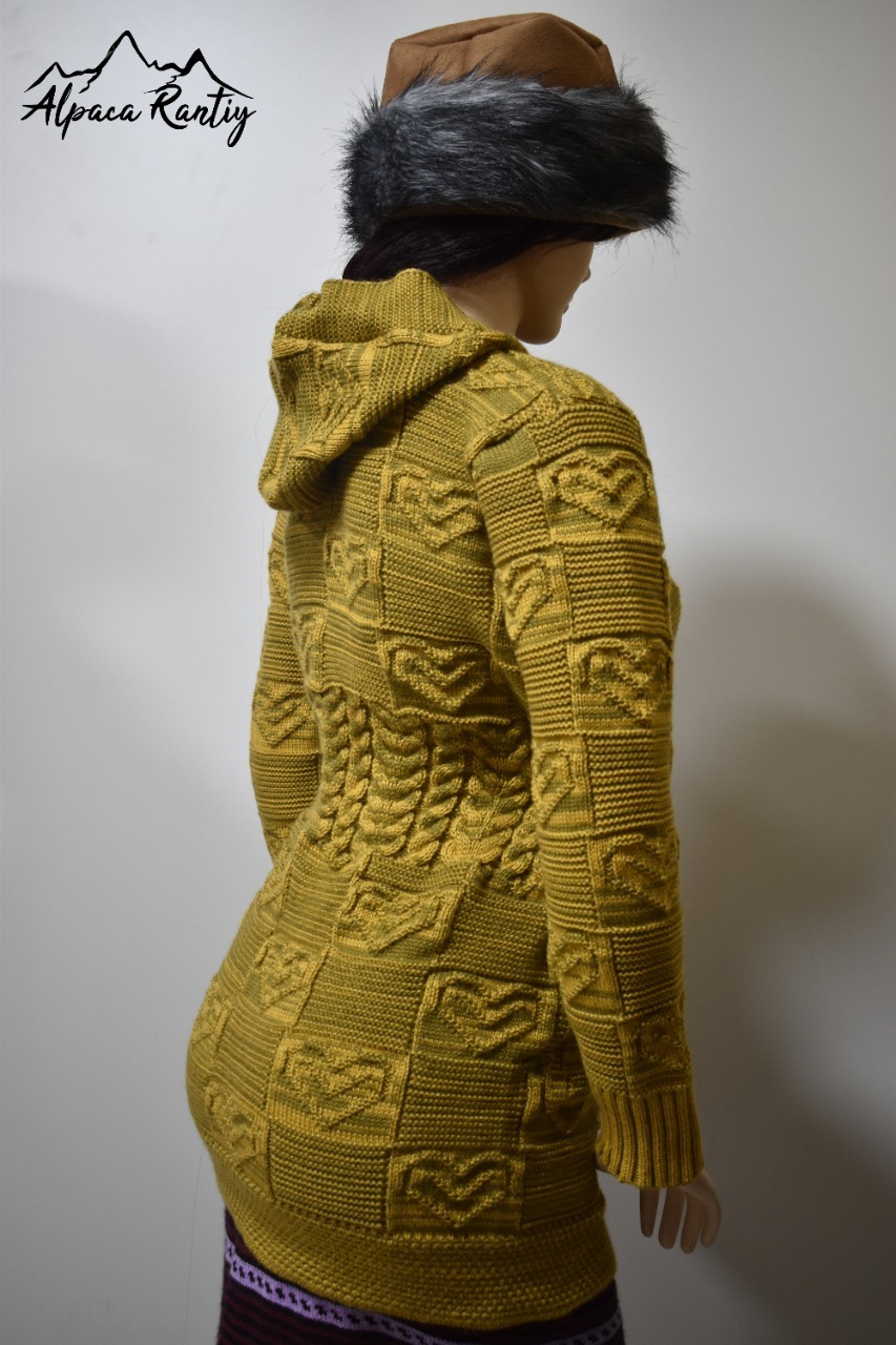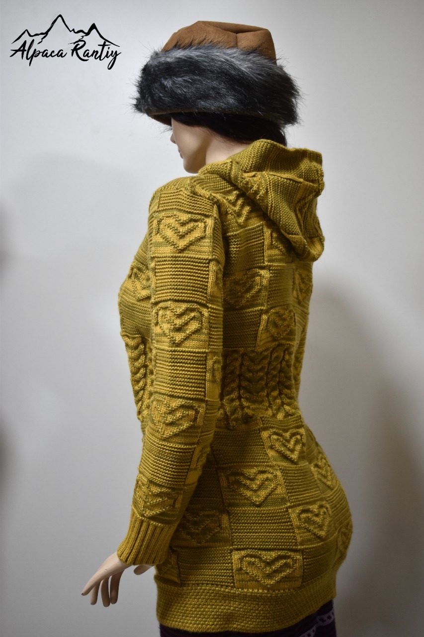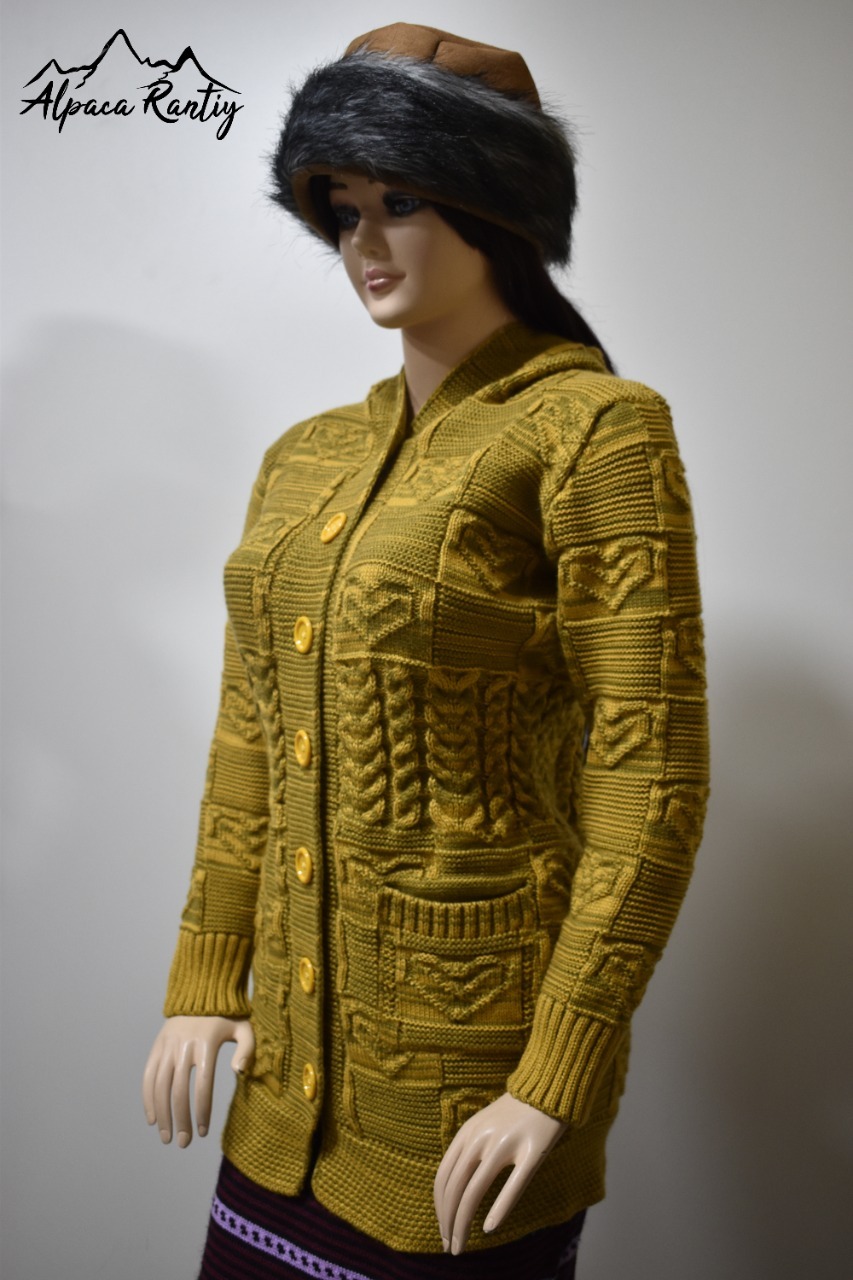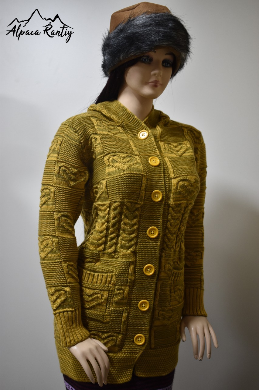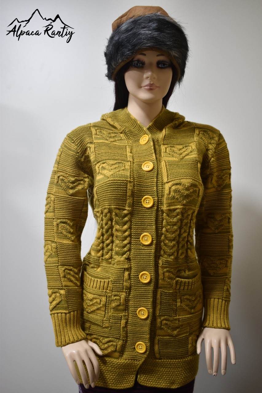 Esta prenda es una chompa larga de tejido artesanal elaborada con fibras en material Wayra, ideal para climas fríos por su suavidad, calidez y resistencia.