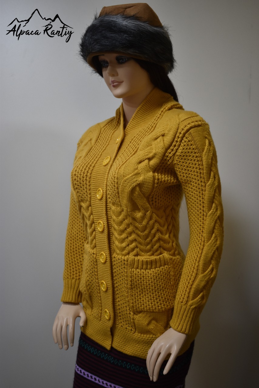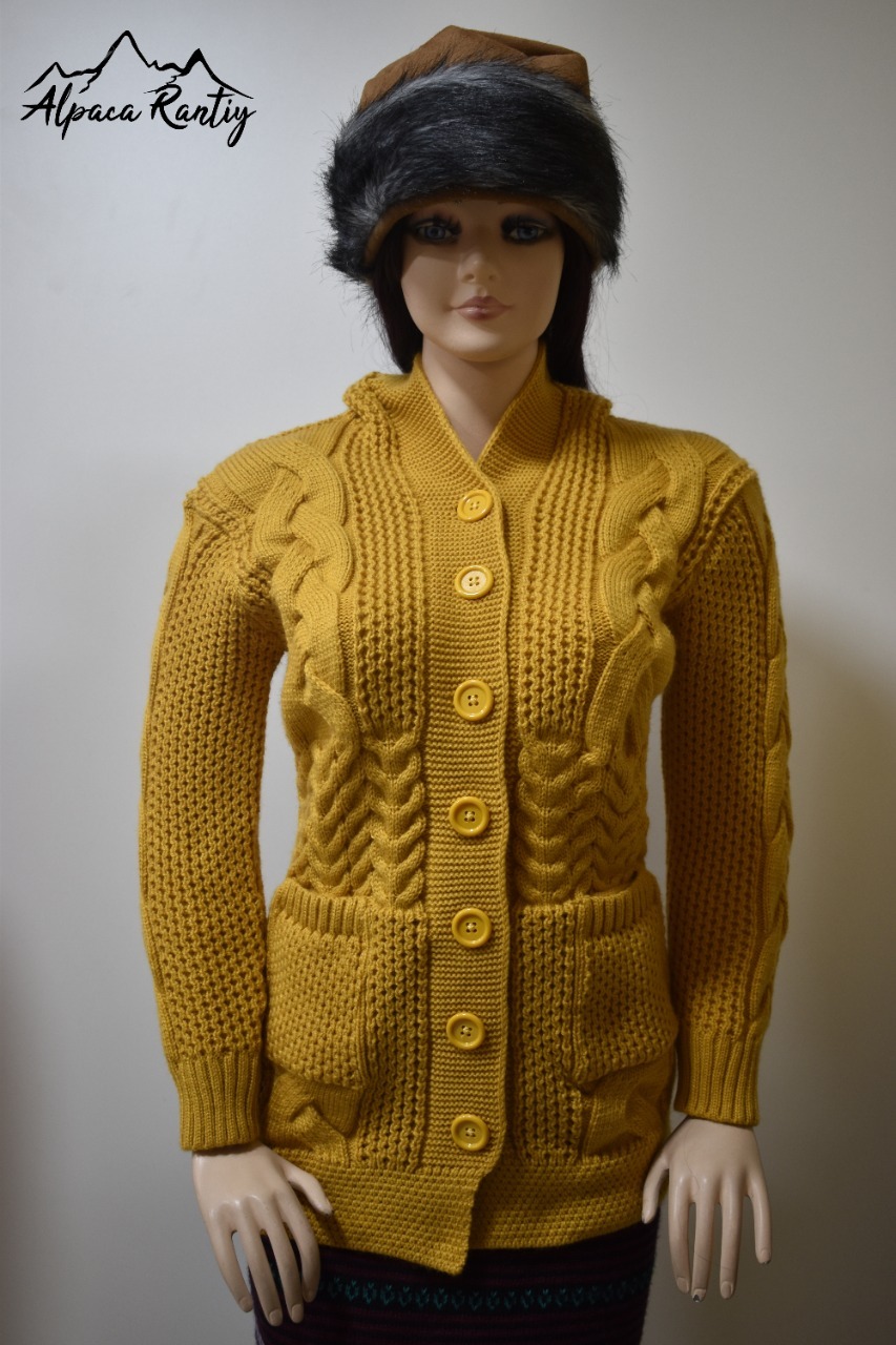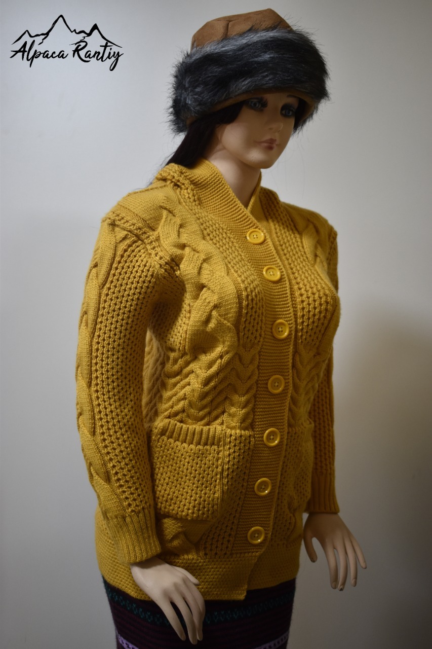 Abrígate con estilo con esta hermosa chompa de tejido grueso y diseño trenzado. Confeccionada con material suave y cálido, es perfecta para mantenerte cómoda en los días fríos. Su corte entallado realza la figura, mientras que los bolsillos frontales y los botones grandes aportan practicidad y encanto.