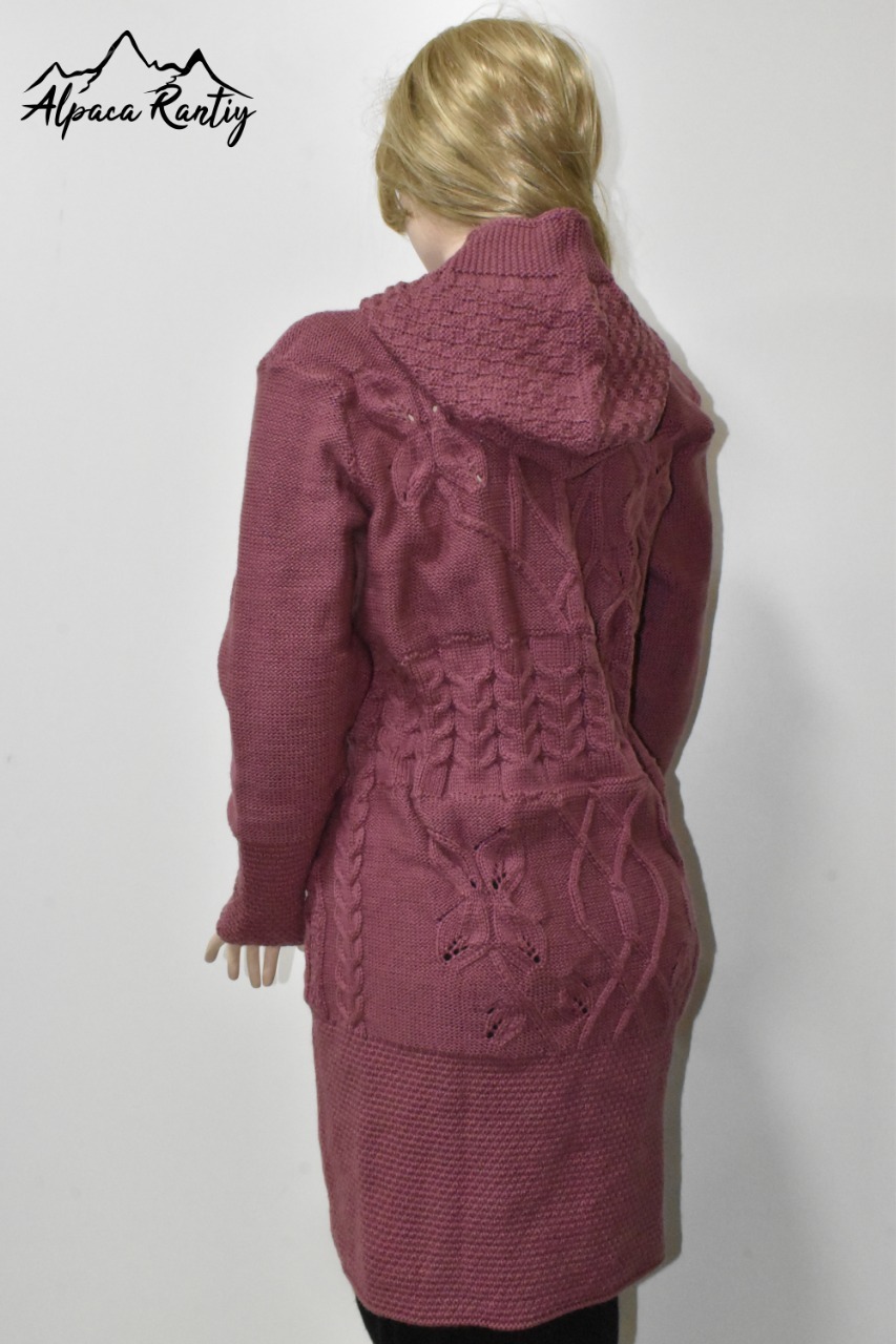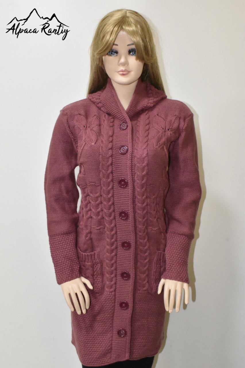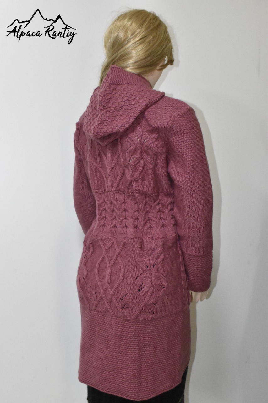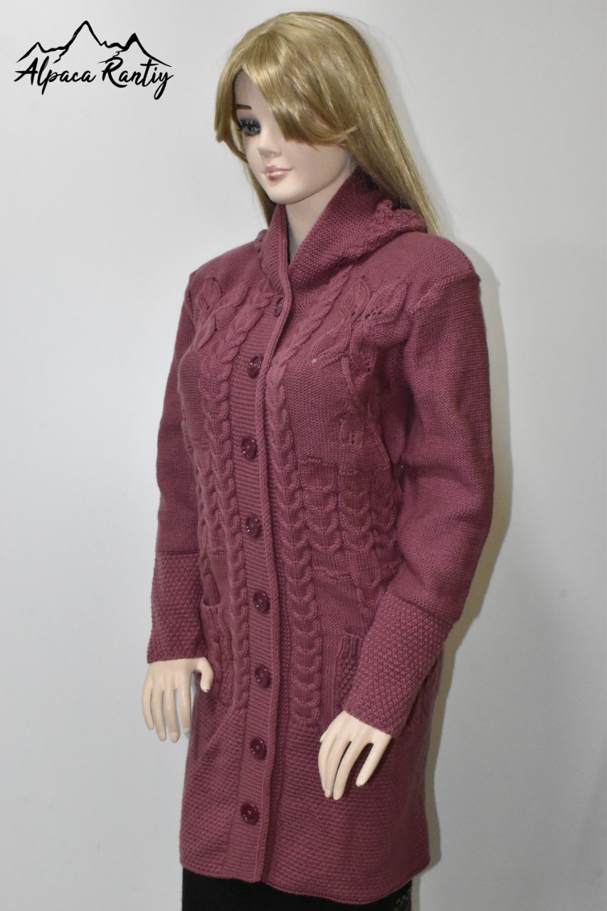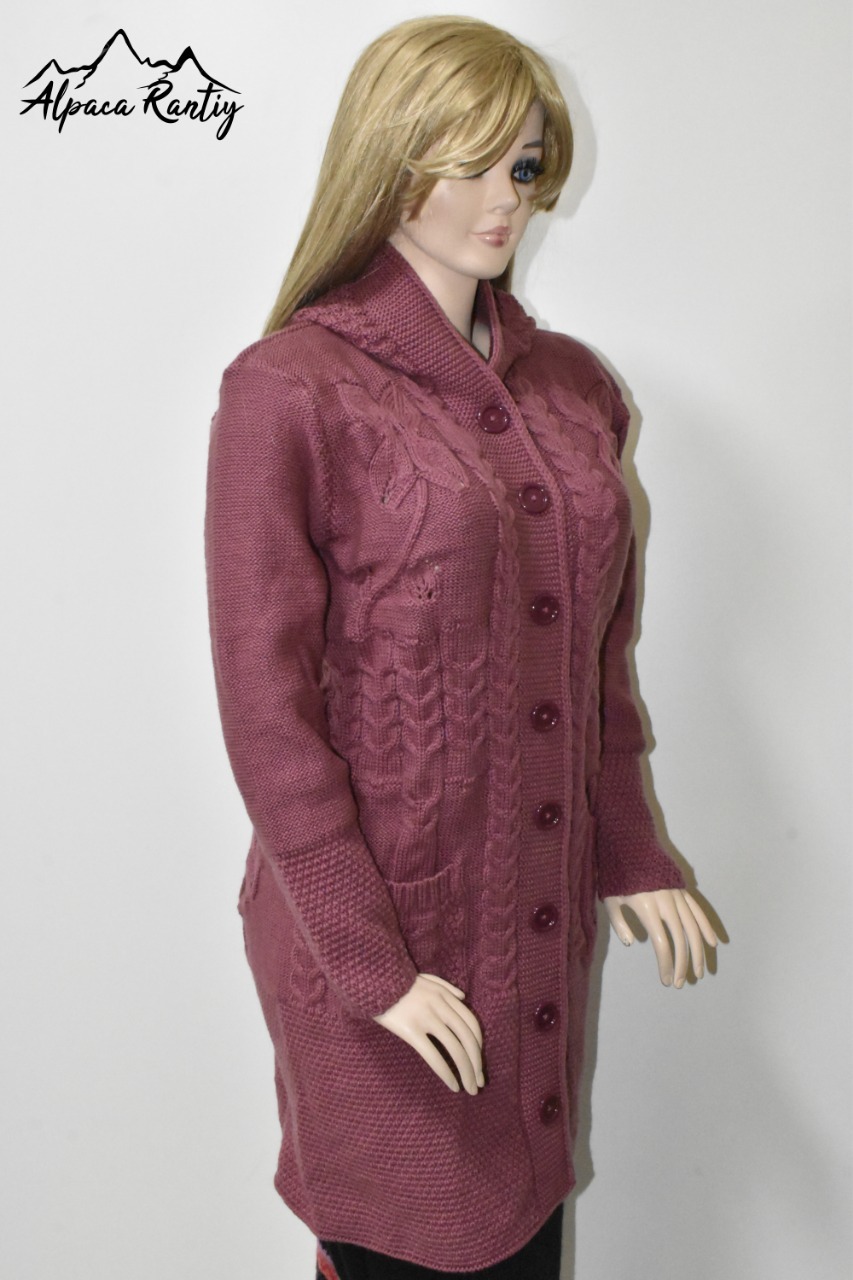 - Textura: El diseño incorpora hermosos motivos de trenzas y ochos, que recorren verticalmente la parte frontal y las mangas, añadiendo una rica textura y un toque artesanal.