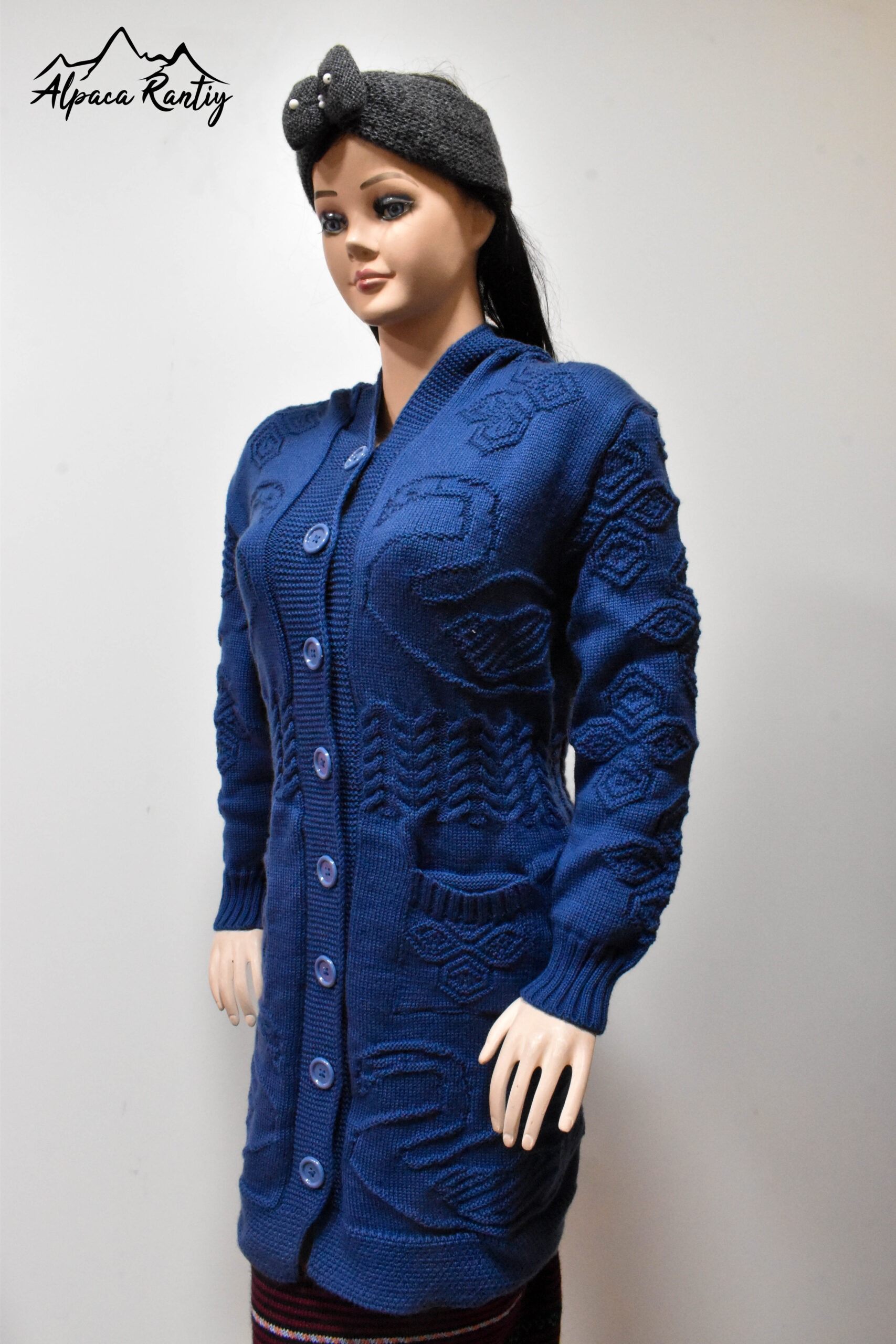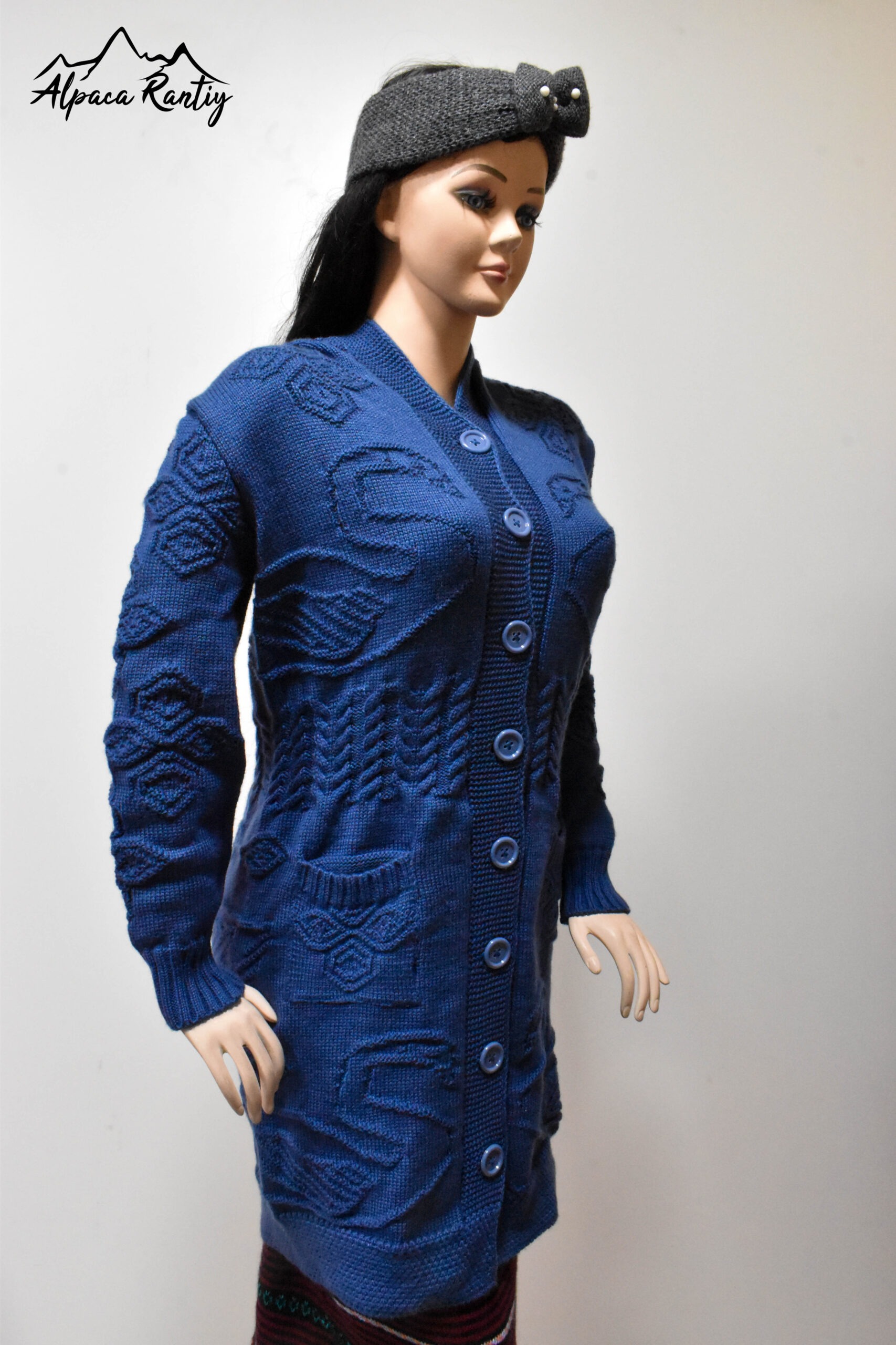 ¡Abrígate con estilo! Esta hermosa chompa larga tejida para mujer está confeccionada en un vibrante color que ilumina cualquier look. Su diseño artesanal resalta con relieves de figuras geométricas y patrones únicos en toda la prenda, lo que la convierte en una pieza llamativa y sofisticada.