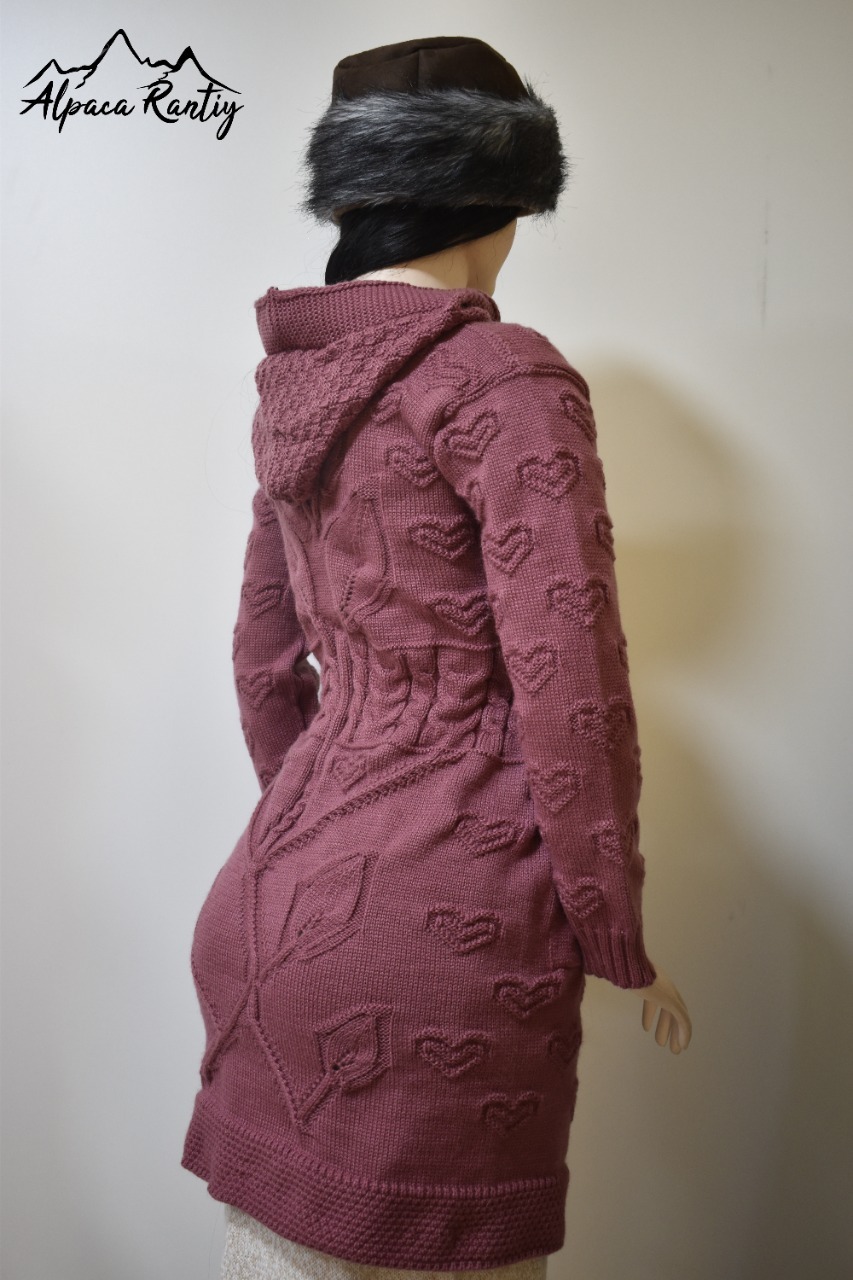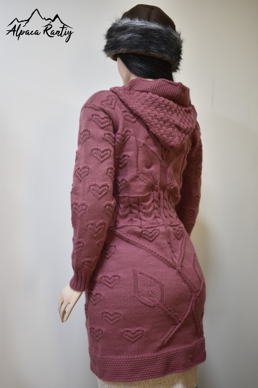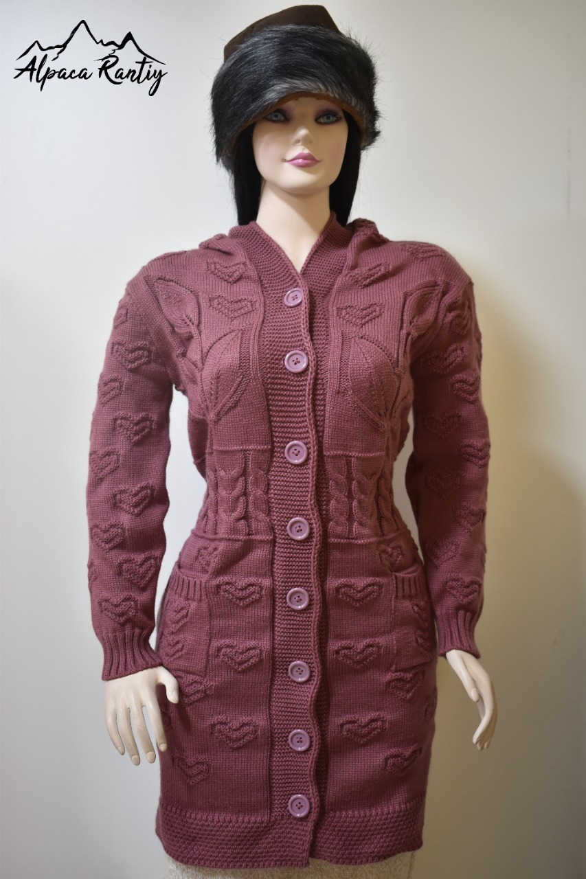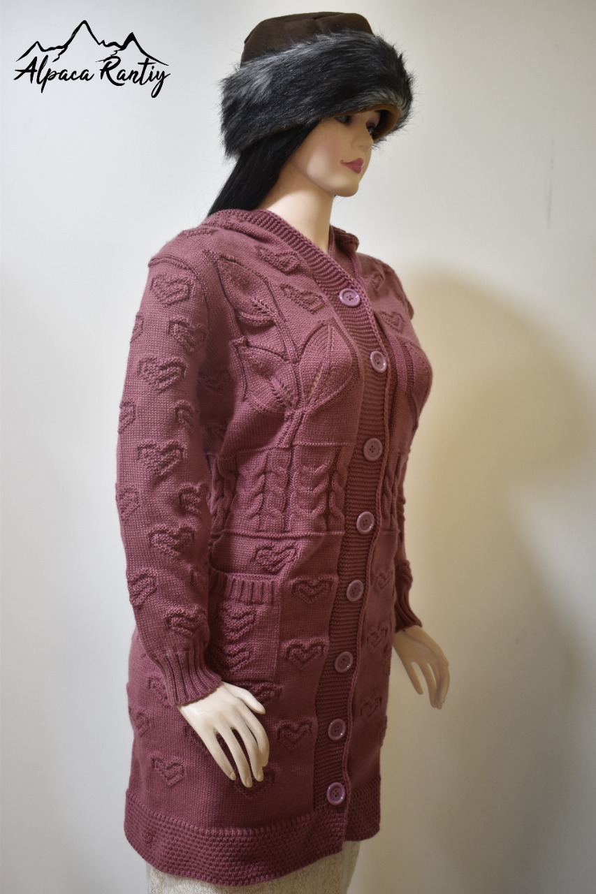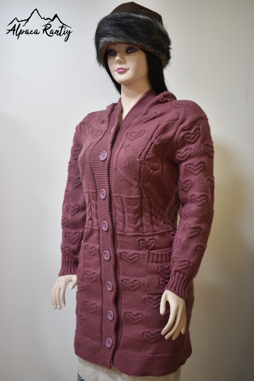 Diseño: Chompa larga con detalles en relieve de corazones tejidos en todo el cuerpo y mangas, que aportan un estilo romántico y femenino.
