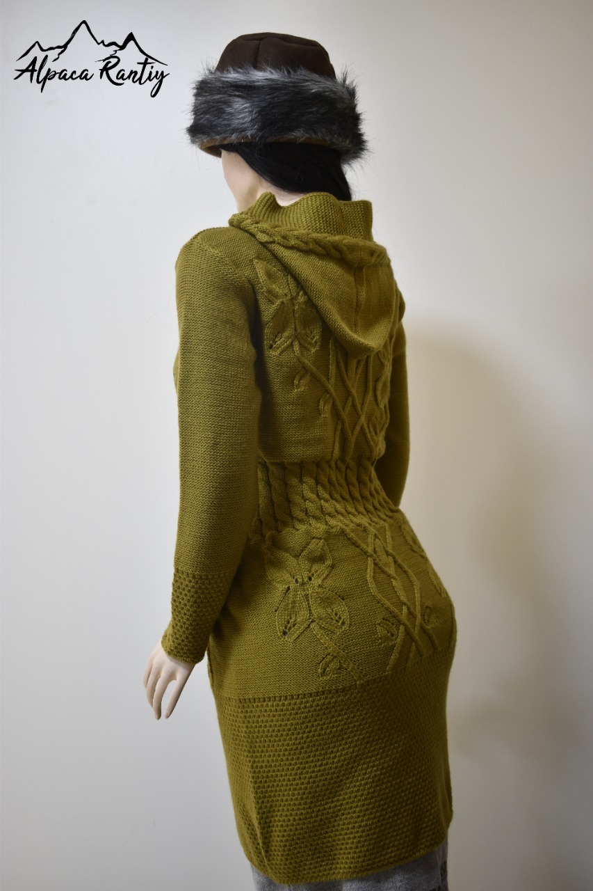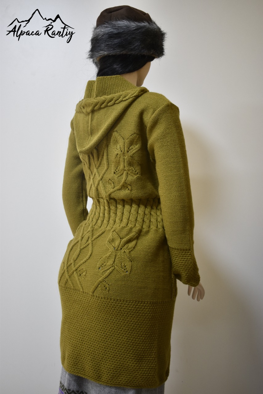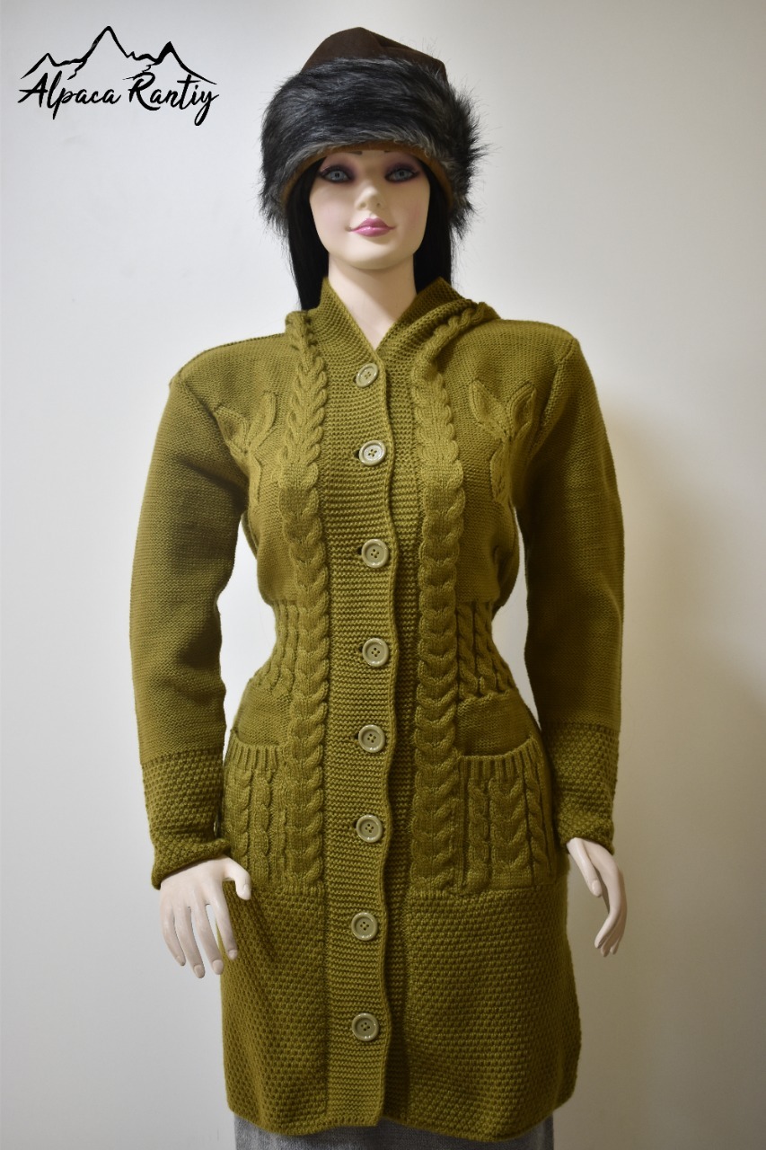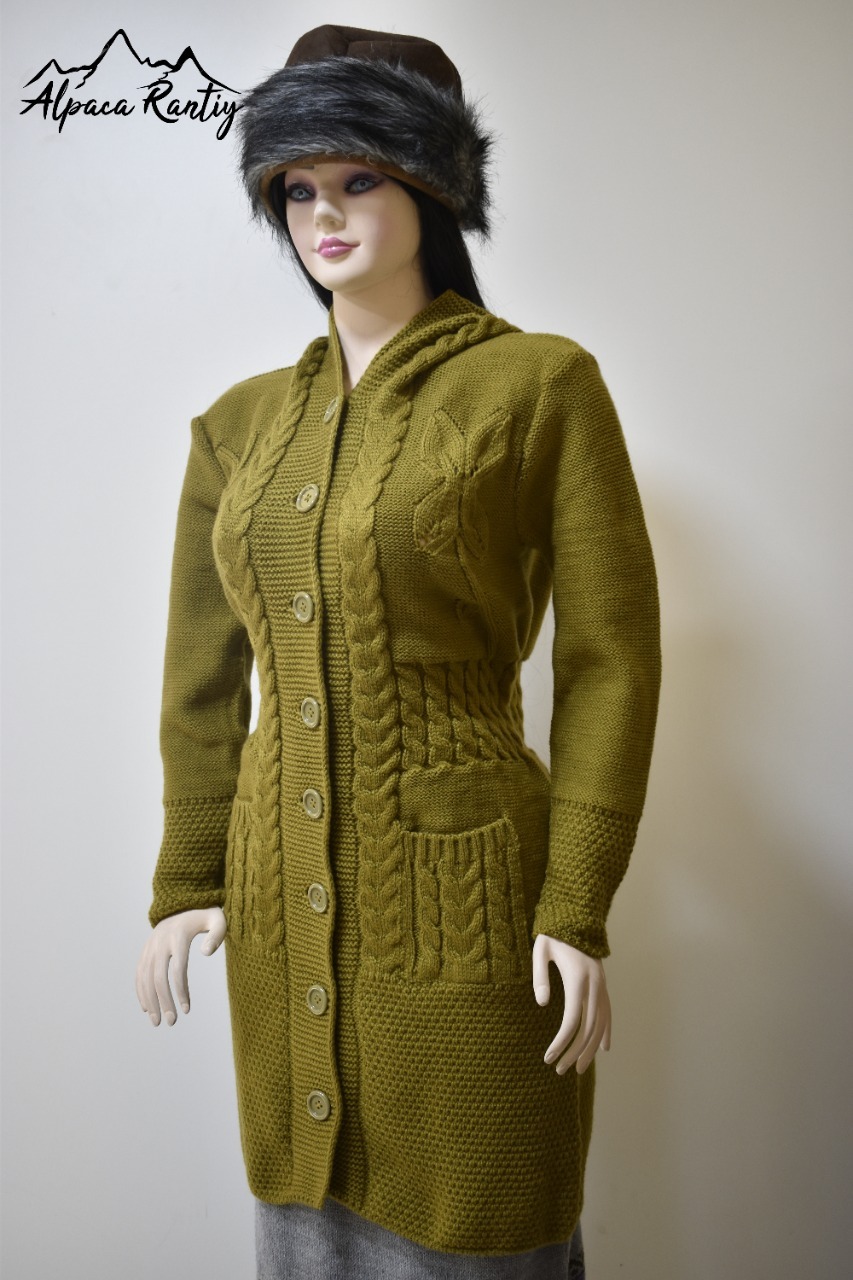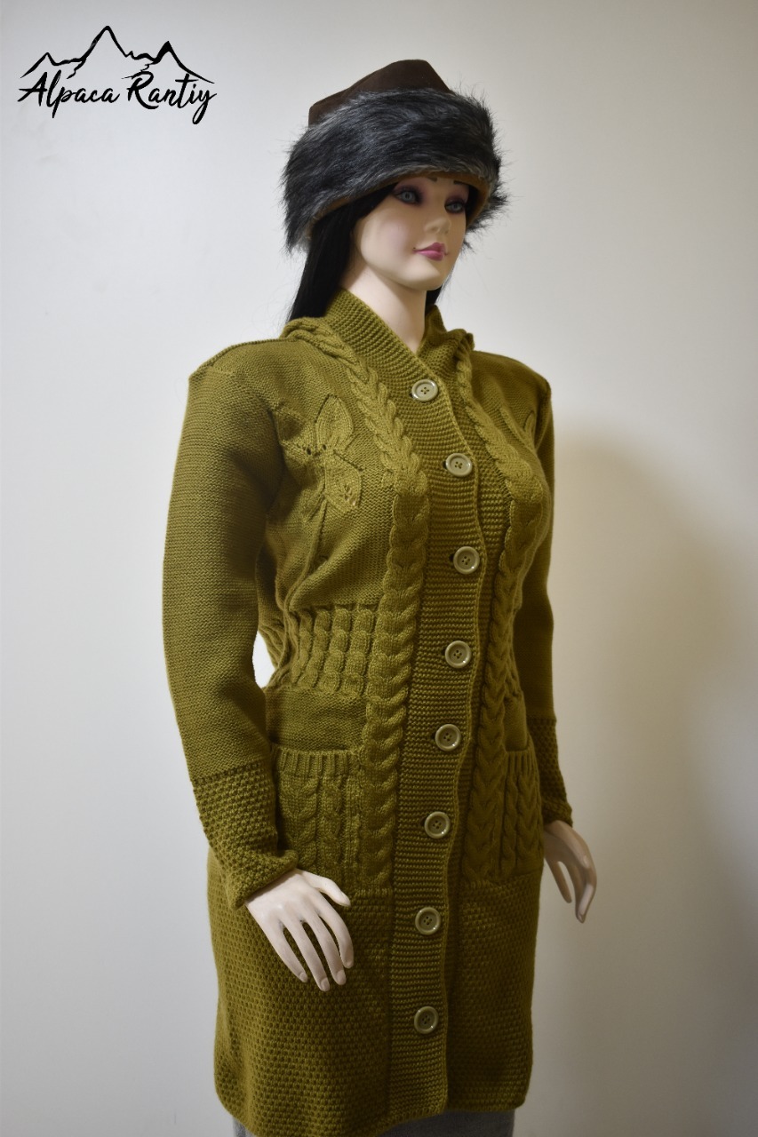 Abrígate con elegancia con esta chompa larga de diseño artesanal. Te presentamos una prenda femenina, ideal para el invierno o los días fríos.