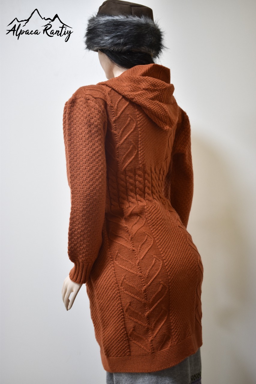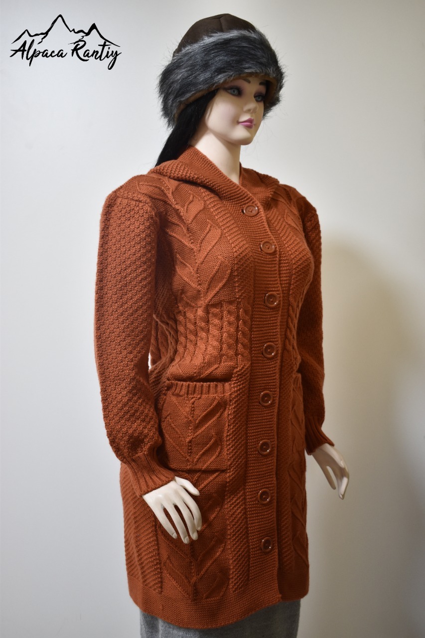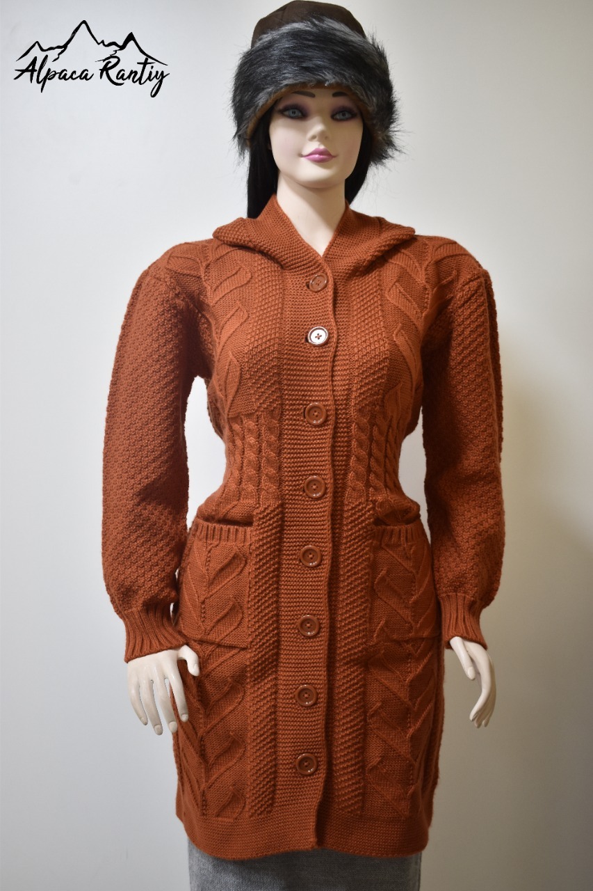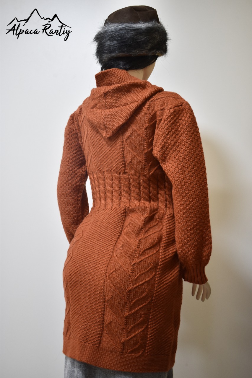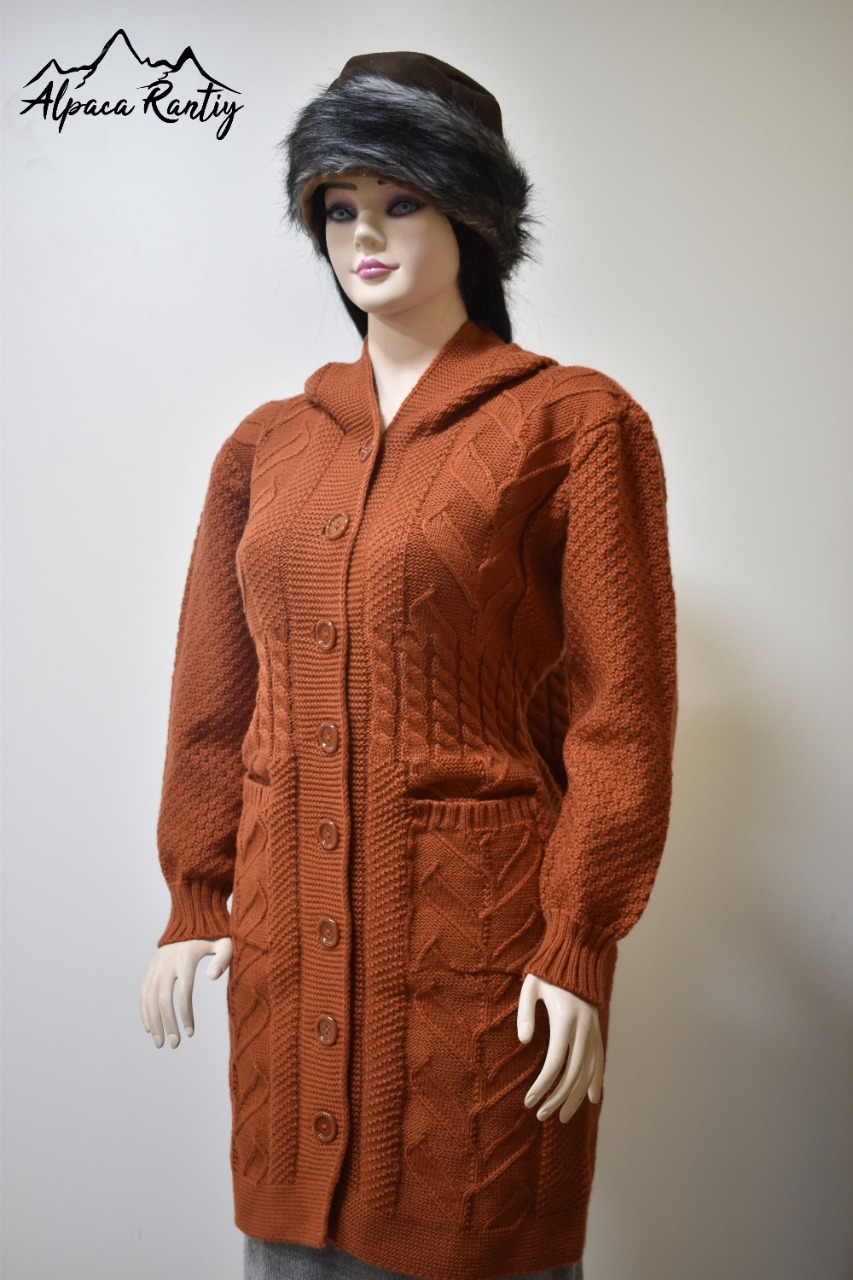 Chompa larga tipo abrigo para mujer, tejida en un elegante color, ideal para los días fríos. Presenta un diseño artesanal con trenzas tejidas, textura en mangas y bolsillos funcionales. Es una prenda que combina calidez, comodidad y estilo atemporal.
