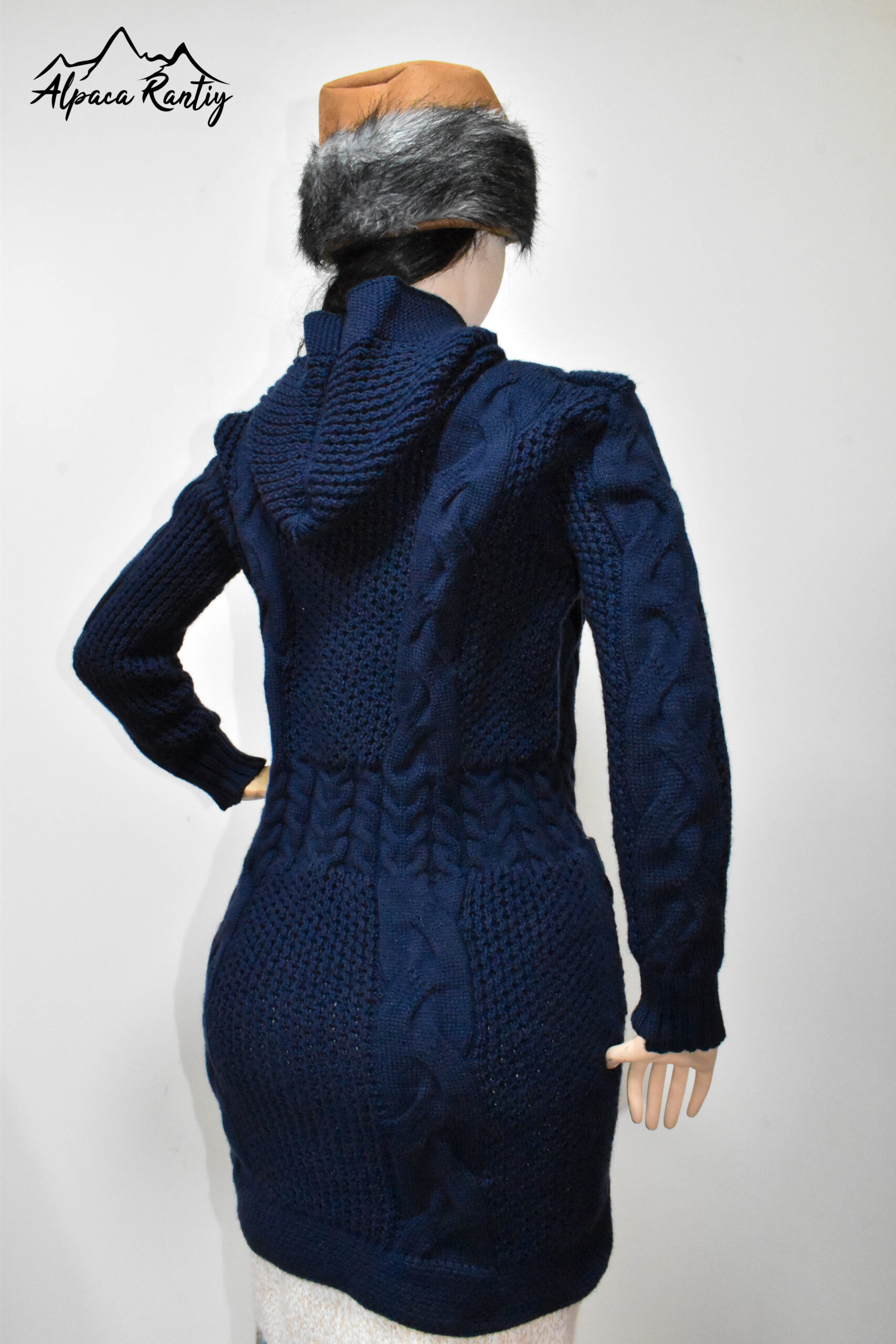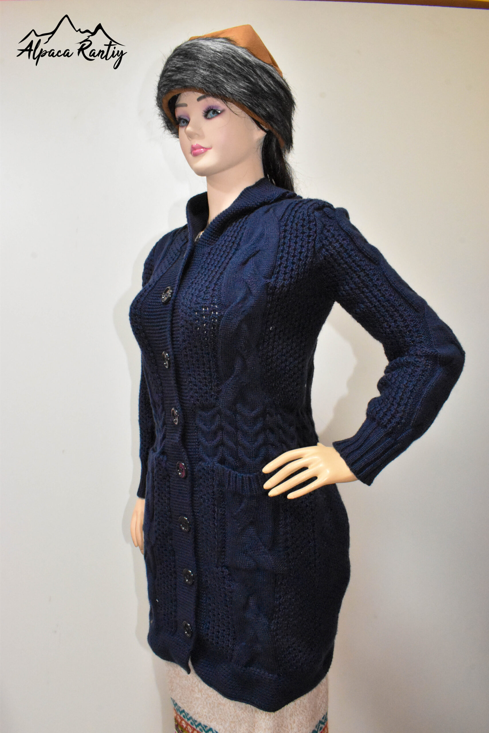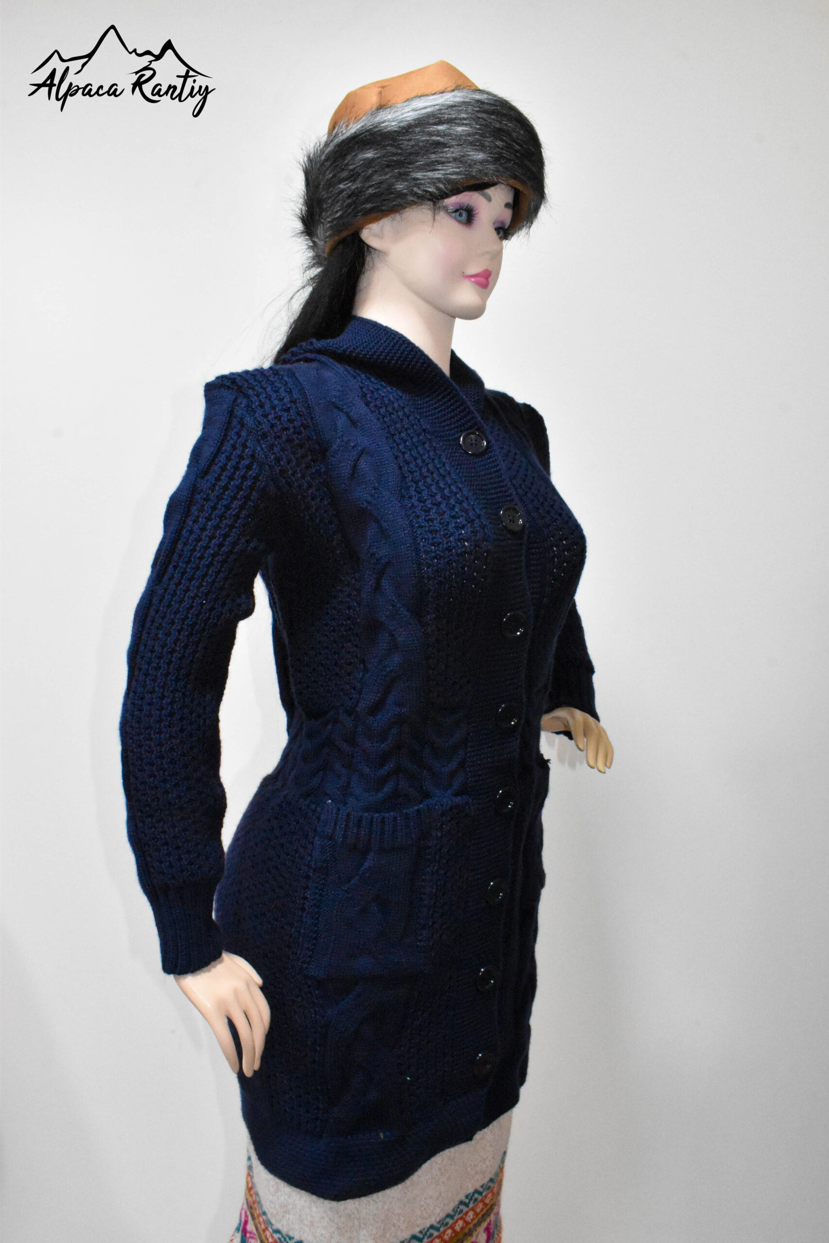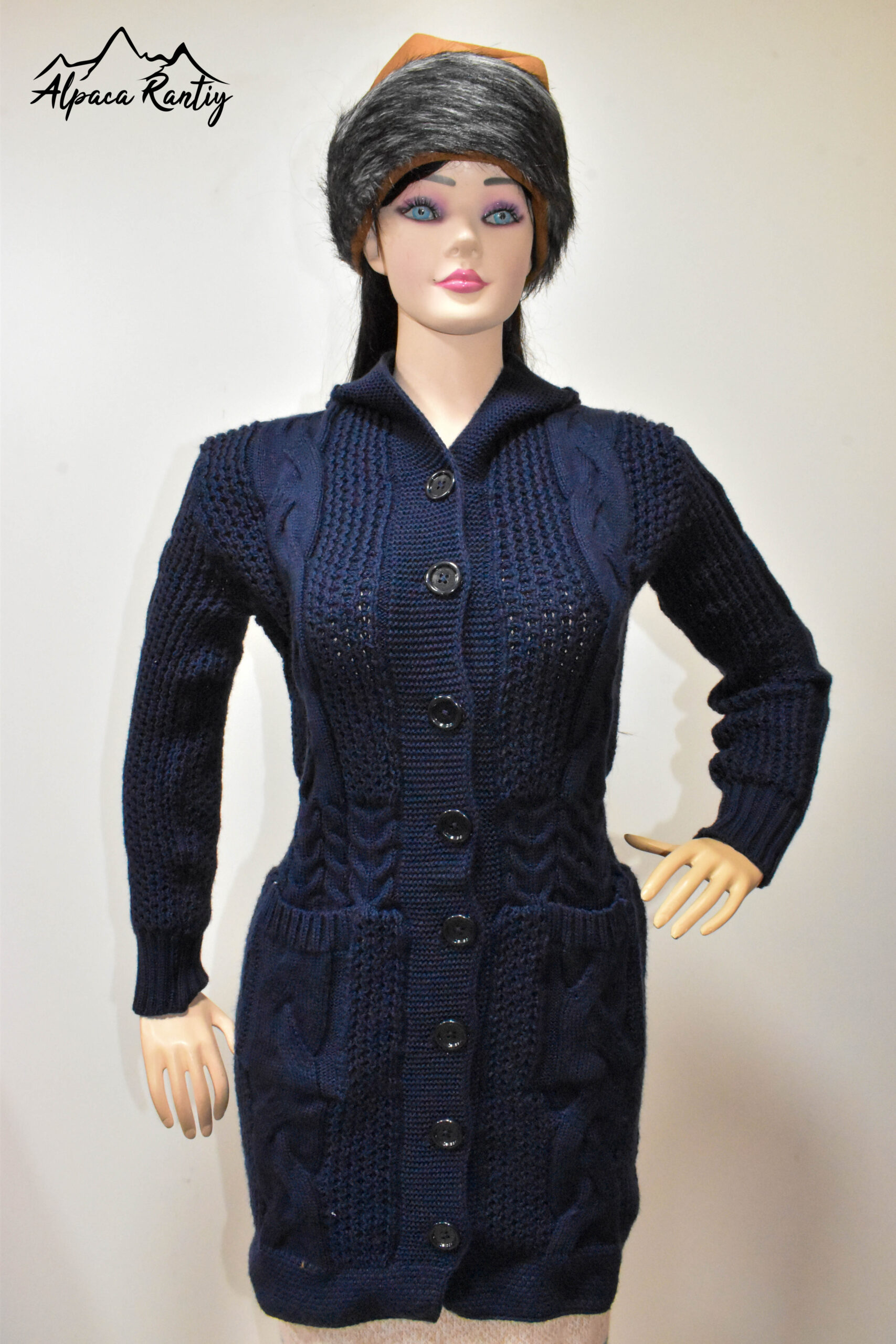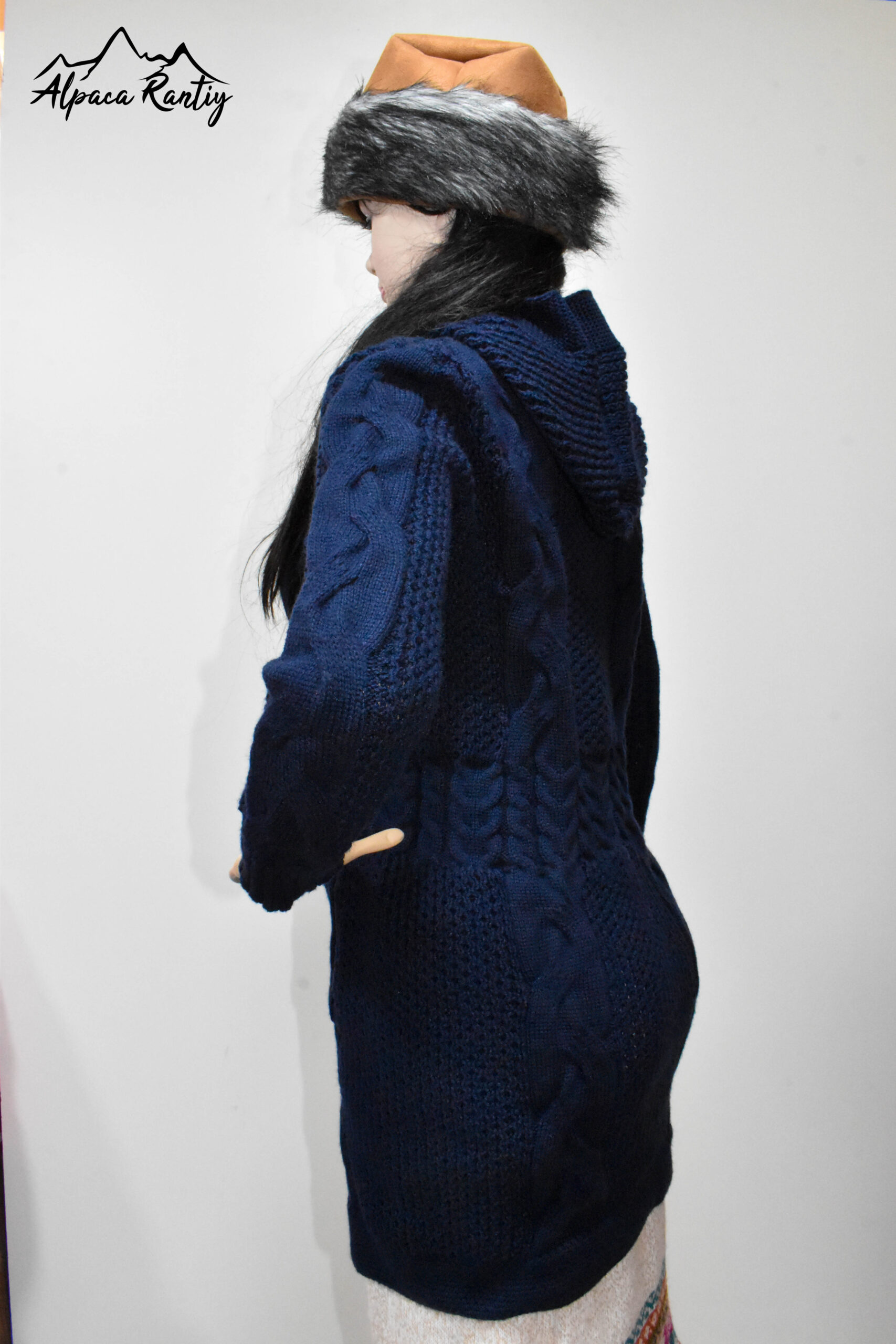 Chompa larga de punto grueso en fibra en material Wayra, confeccionado artesanalmente con un tejido denso y trenzado que cubre desde los hombros hasta justo por debajo de la rodilla, con botonadura frontal grande del mismo tono, capucha cómoda y bolsillos funcionales a la altura de la cadera.
