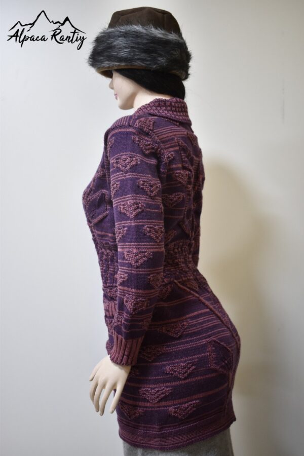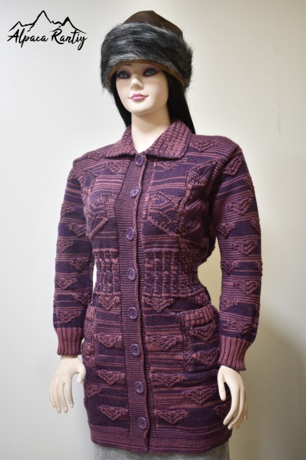 Elegante y abrigadora chompa larga para mujer, diseñada con un tejido fino que realza la figura gracias a su corte entallado en la cintura. Presenta un acabado con botones frontales, bolsillos prácticos y un cuello camisero clásico, ideal para combinar con diferentes estilos.