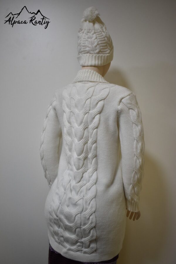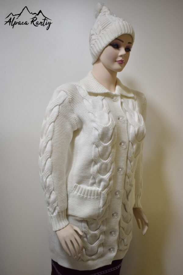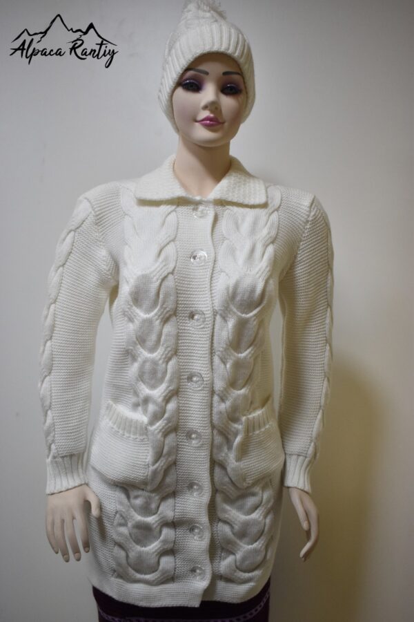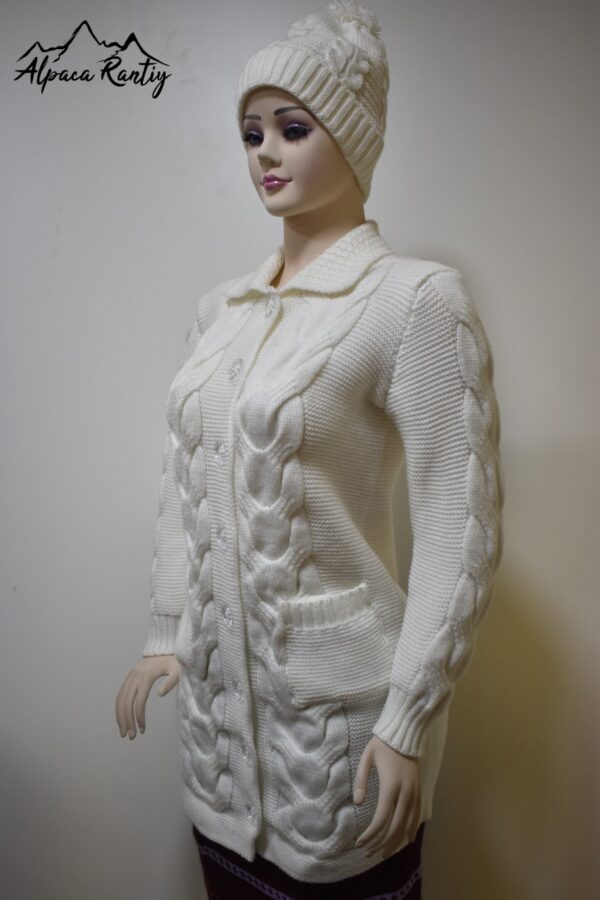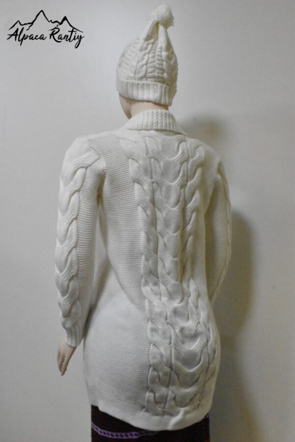 Este es una chompa de la marca Alpaca Rantiykuy, ideal para mantener la calidez con un toque de elegancia invernal. Su diseño y el tejido con patrón de ochos prominente lo hacen una pieza destacada. Es perfecto para usarse como una capa abrigadora o como una prenda exterior en climas fríos.