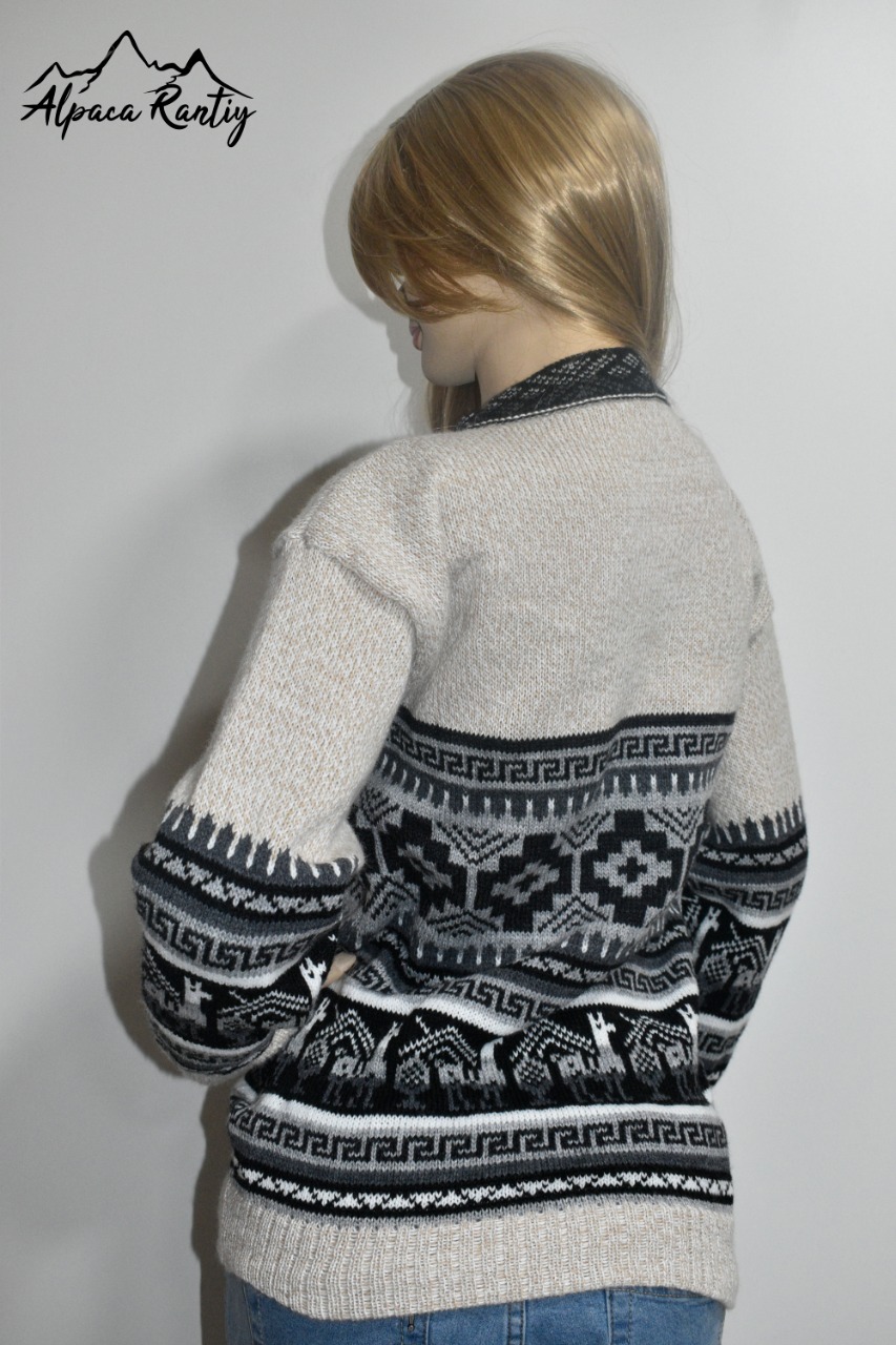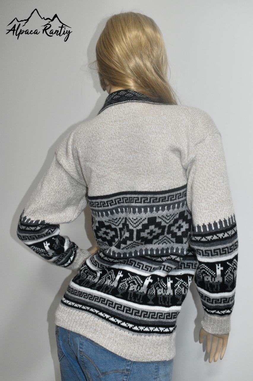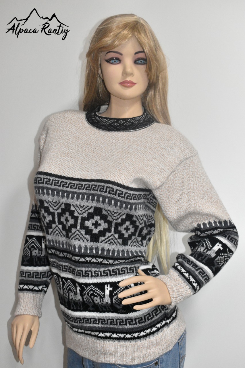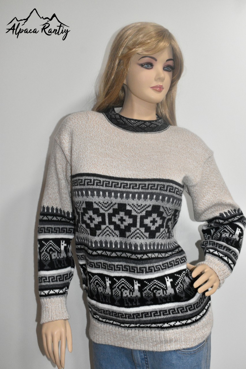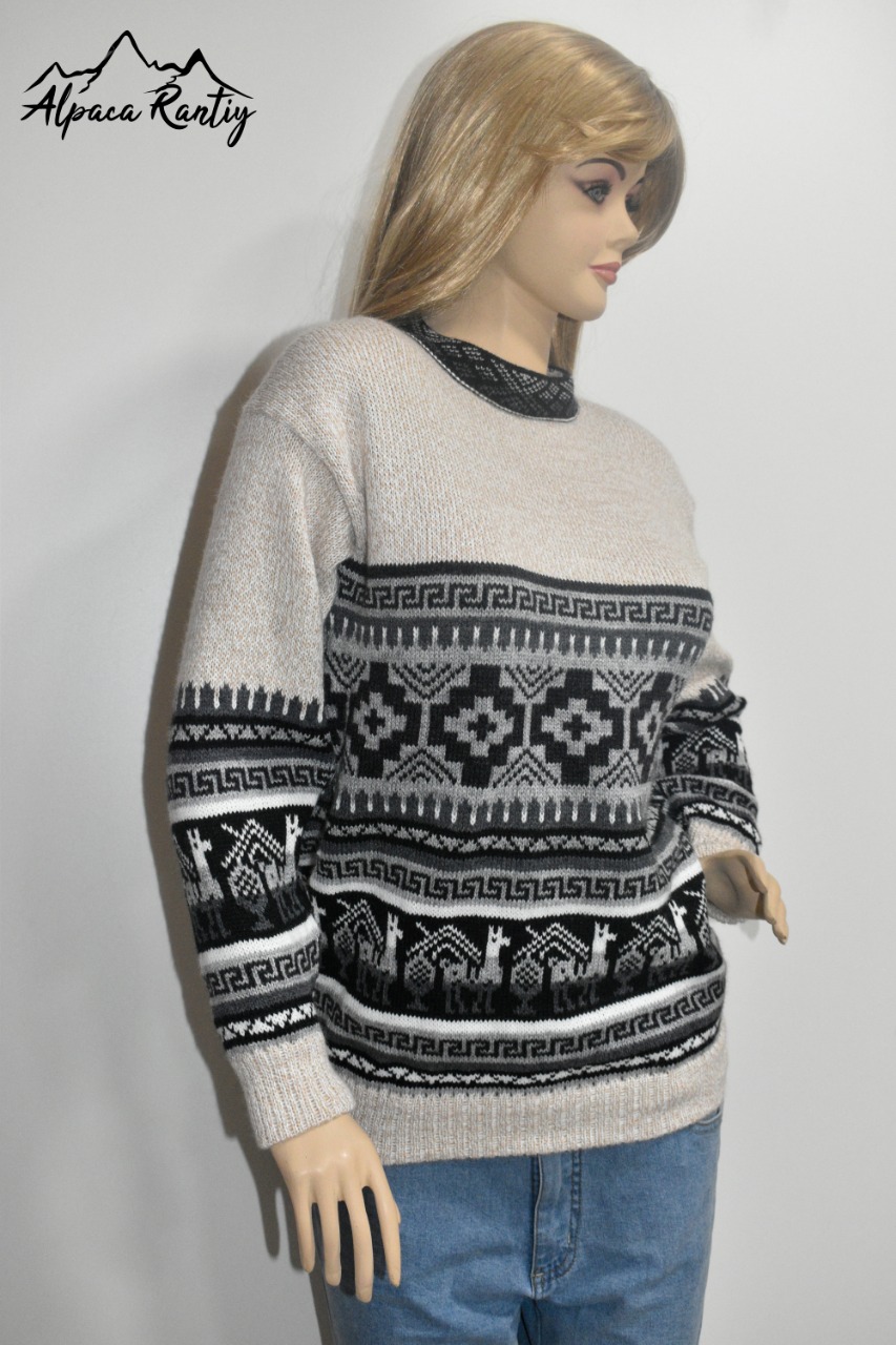- Diseño Andino Geométrico y Figurativo: La parte central del pecho, las mangas y el dobladillo inferior presentan una serie de franjas con diseños intrincados: