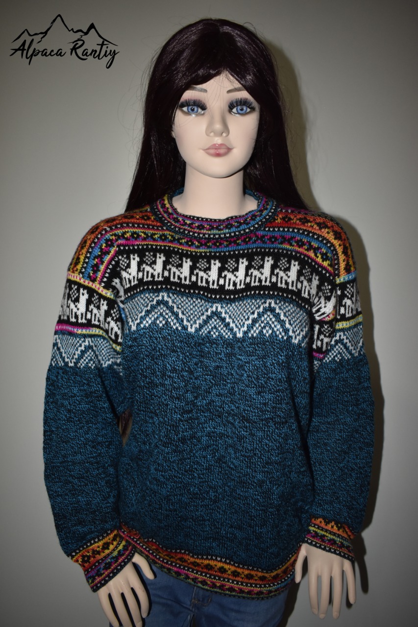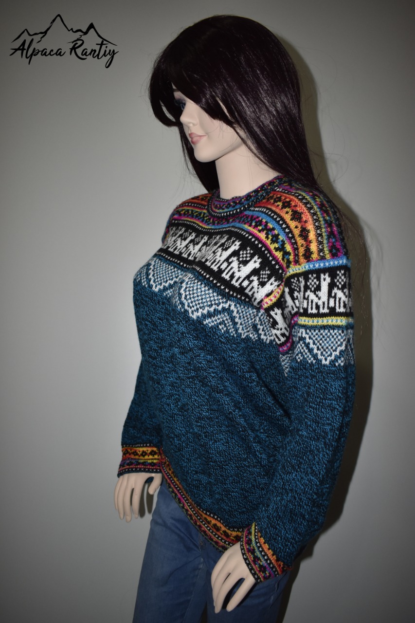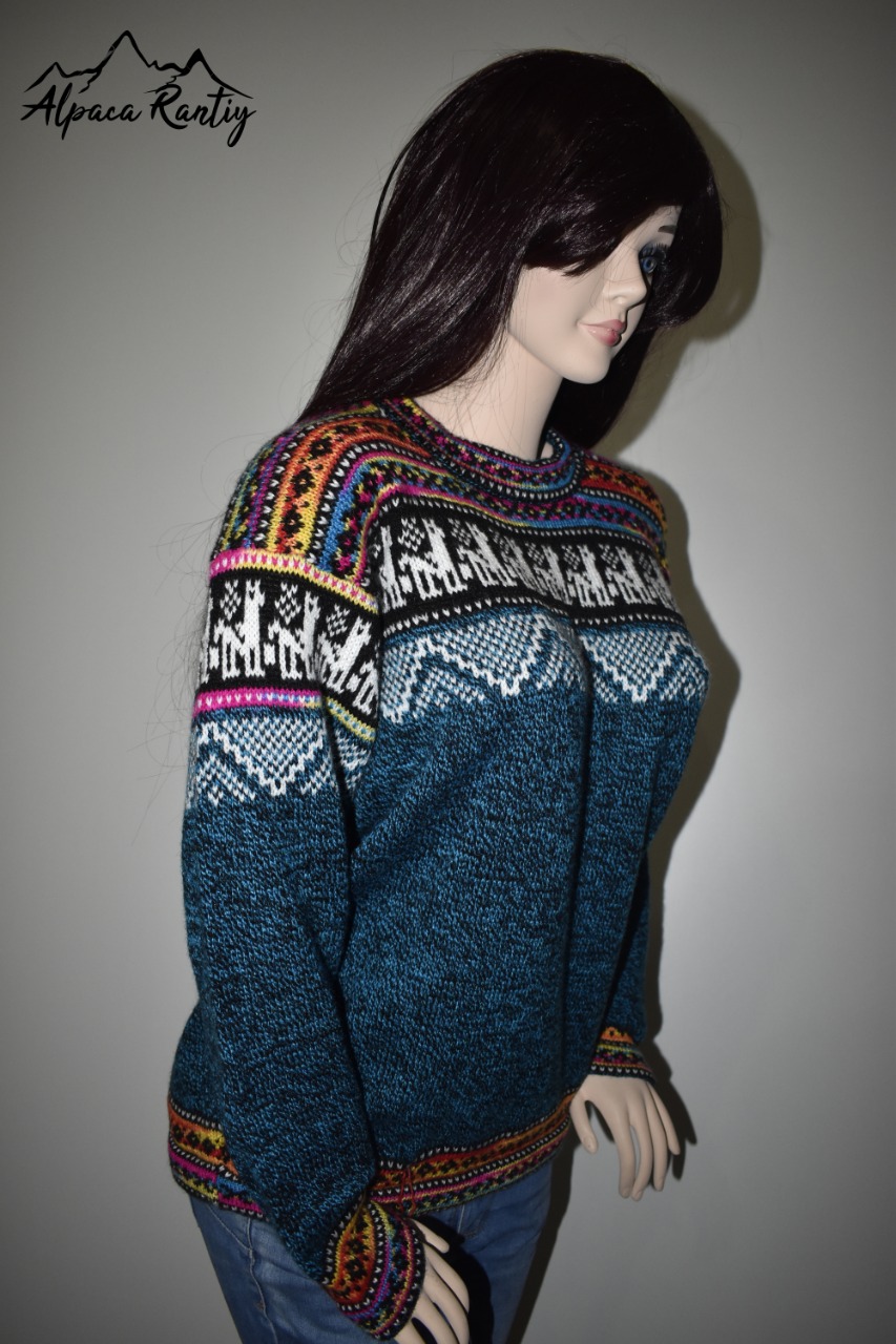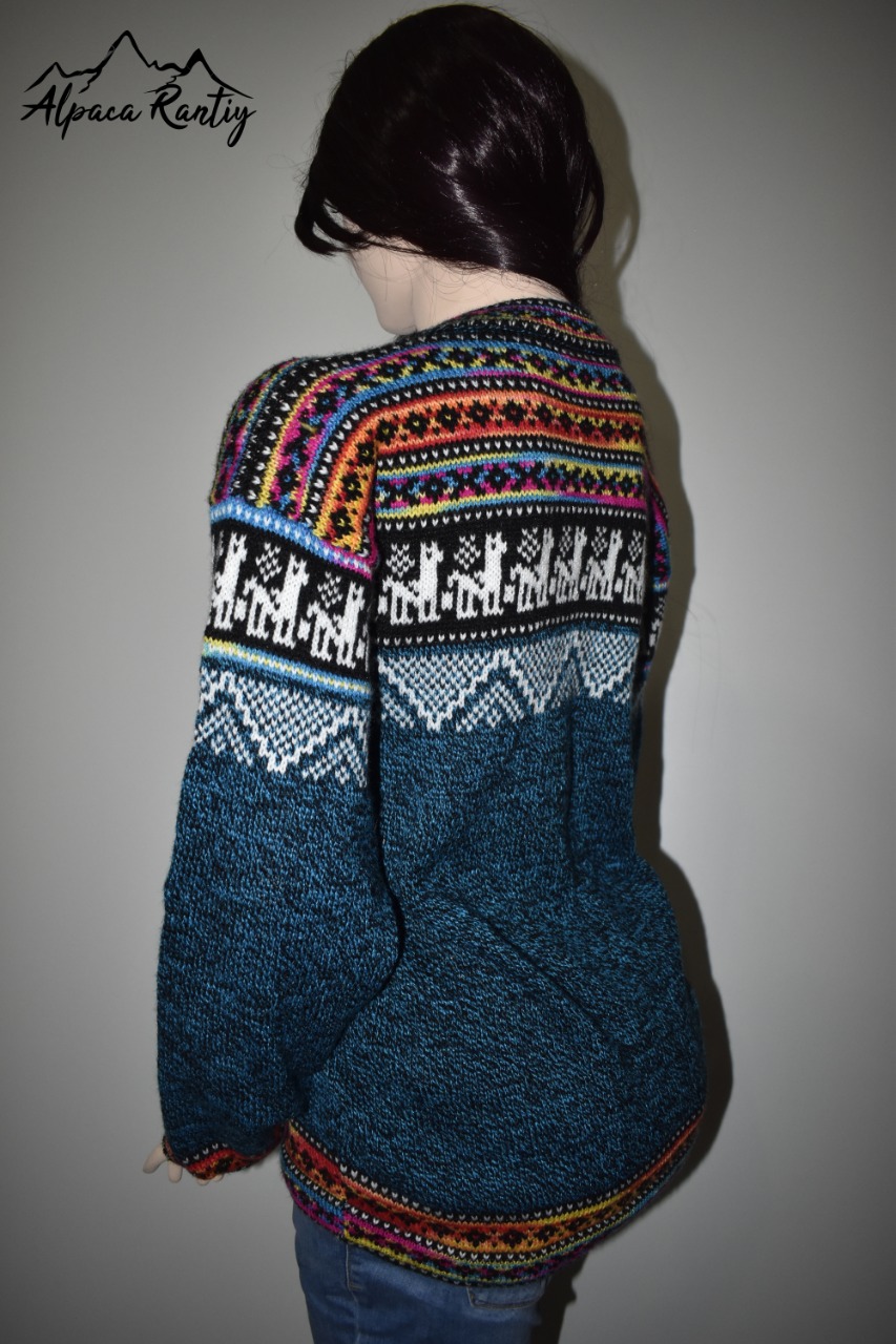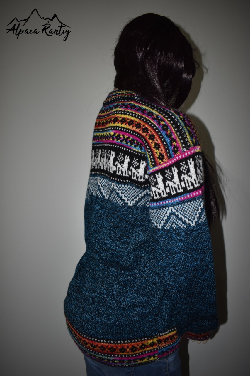 Este llamativo suéter de la marca «Alpaca Rantiykuy» es una pieza excepcional que combina la calidez y la suavidad de la alpacril con un diseño rico en patrones geométricos y figuras icónicas andinas sobre una base oscura. Es la elección perfecta para quienes buscan una prenda que destaque, ofreciendo confort, tradición y un toque de color.