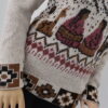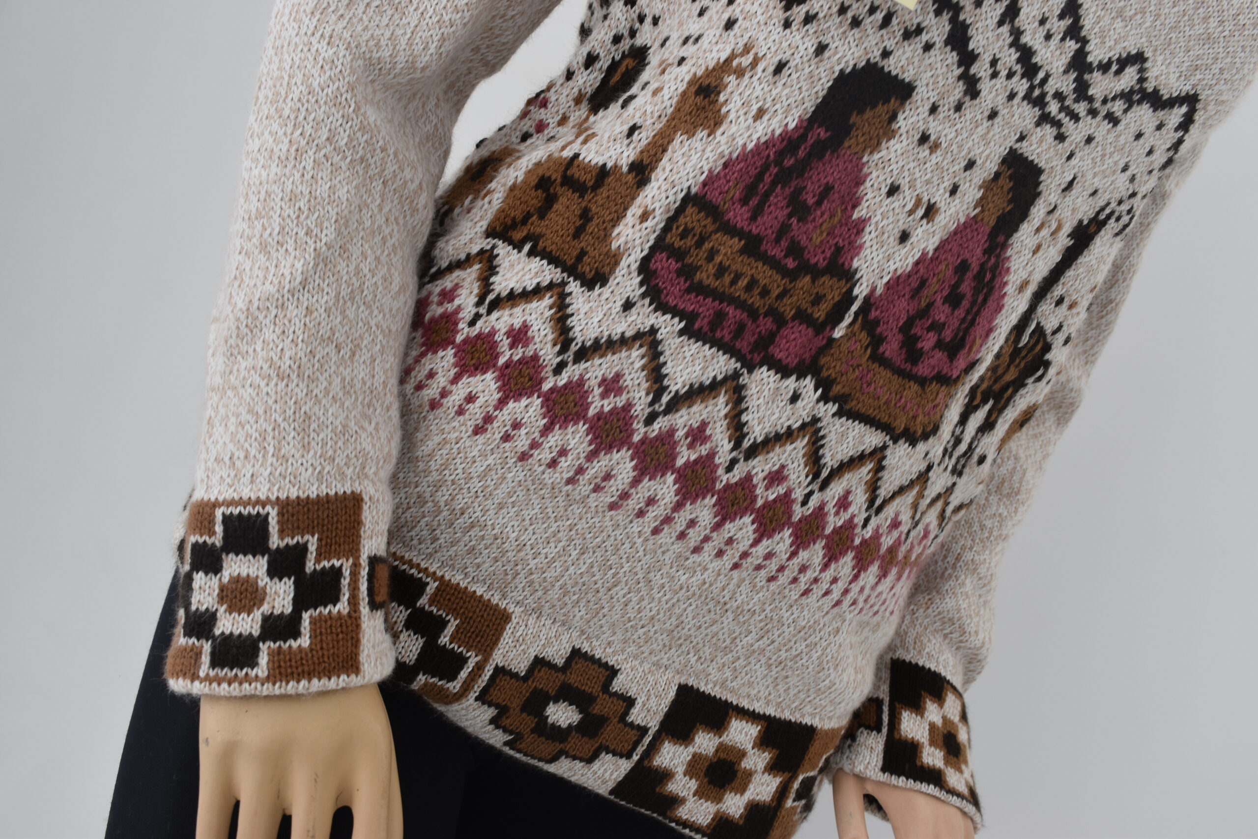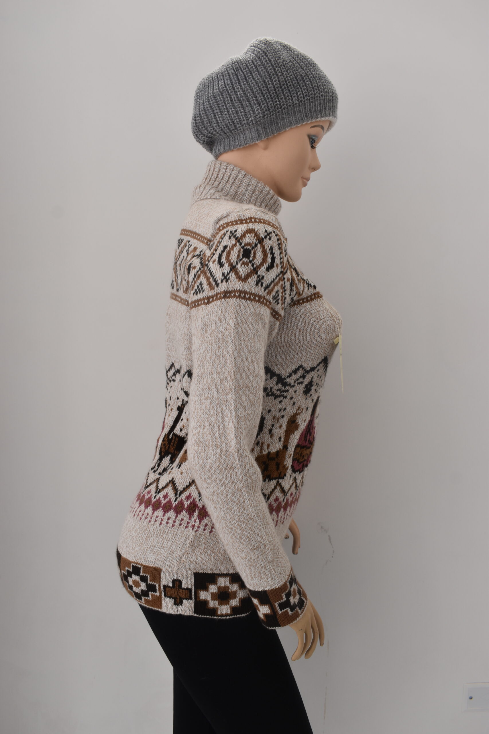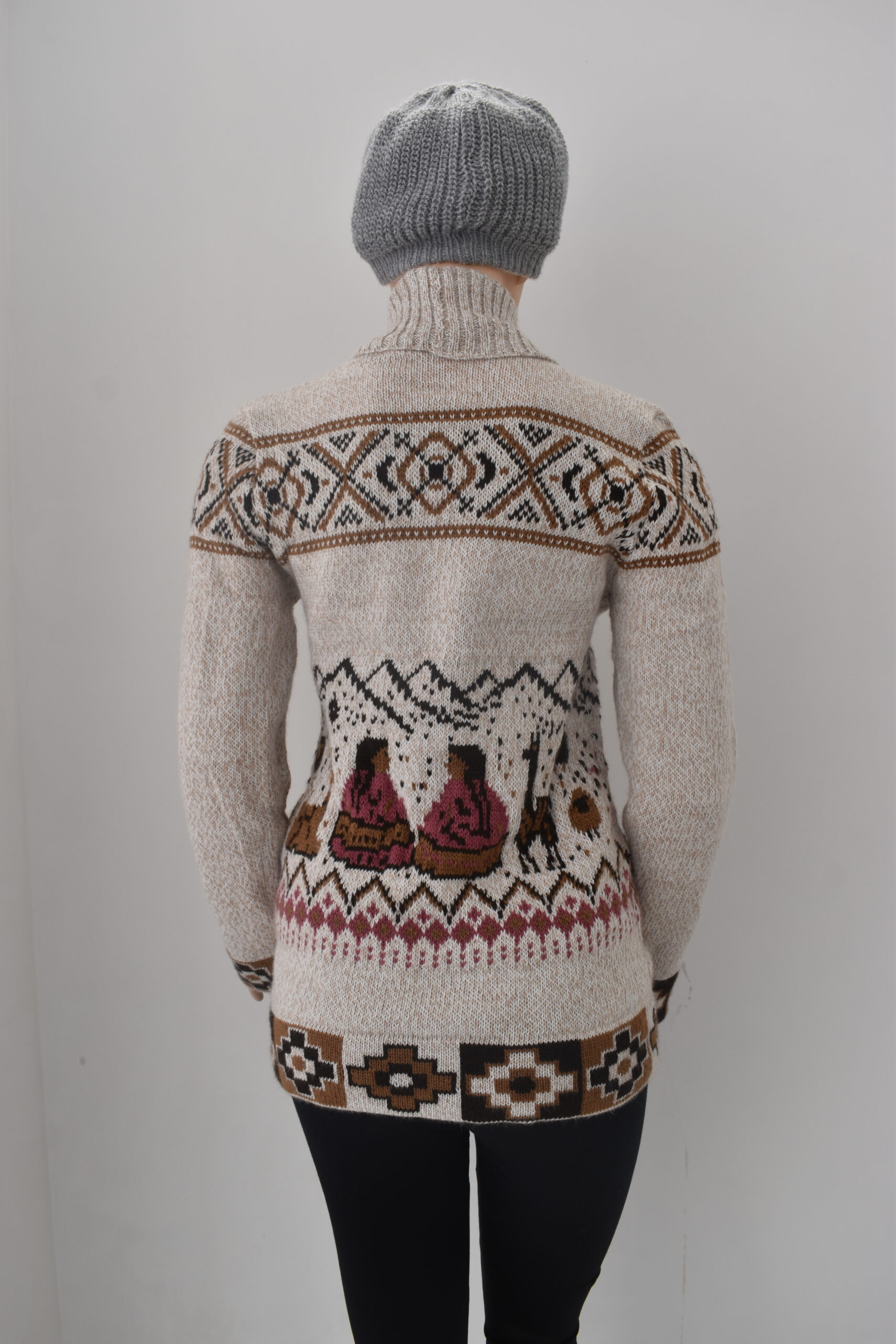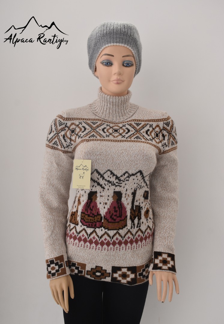 Luce esta hermosa chompa de cuello alto, modelo cholita, con un diseño único de vibrantes matices y encantadoras figuras de cholitas. Inspirada en la rica artesanía peruana y confeccionada en suave y confortable «Alpacril» (80% lana sintética de alta calidad, 20% fibra de alpaca).