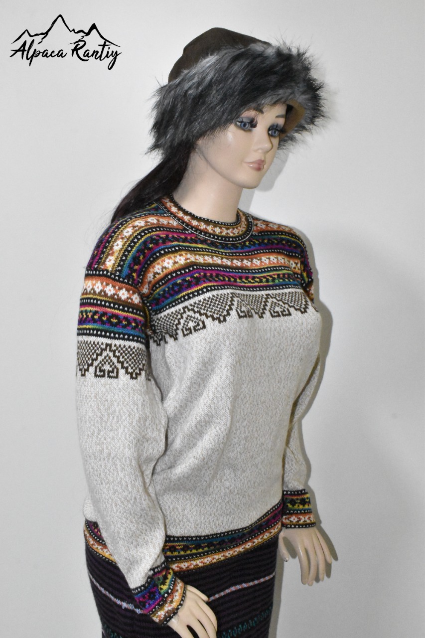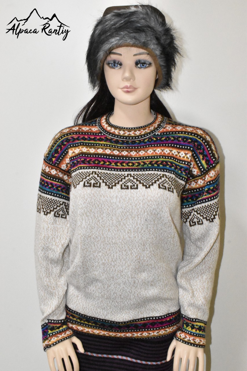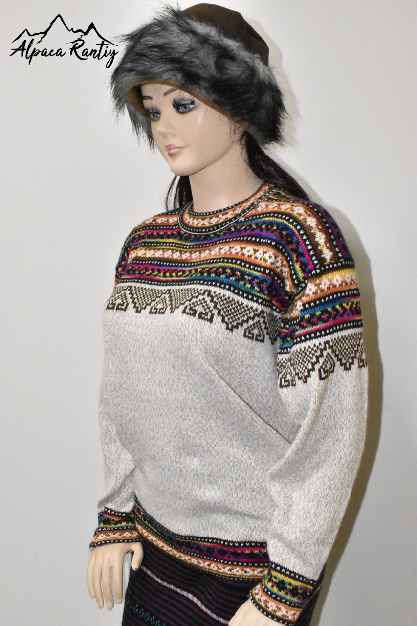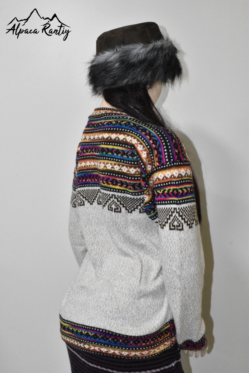 Este atractivo suéter de la marca «Alpaca Rantiykuy» es una pieza excepcional que combina la calidez y la suavidad de alpacril con un diseño rico en patrones geométricos inspirados en la cultura andina. Es la elección perfecta para quienes buscan una prenda que destaque, ofreciendo comodidad y un toque artesanal.