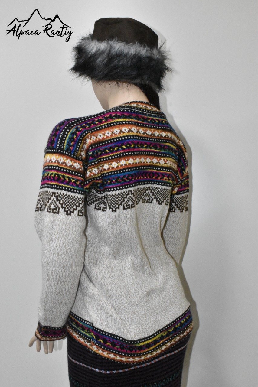 - Detalles Coordinados: Los puños y el dobladillo inferior del suéter replican las bandas de colores vibrantes y patrones geométricos, creado visual y un acabado muy cuidado.