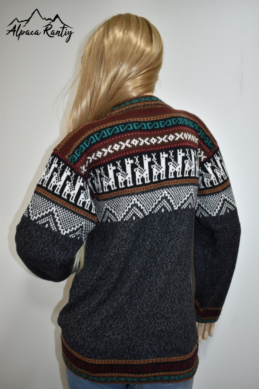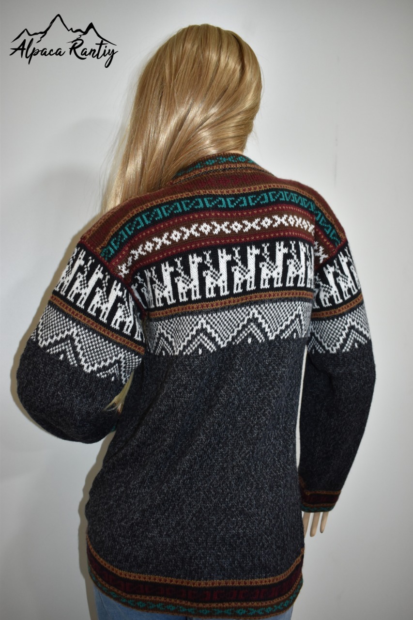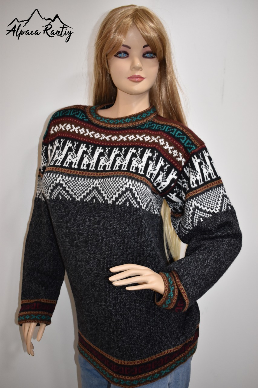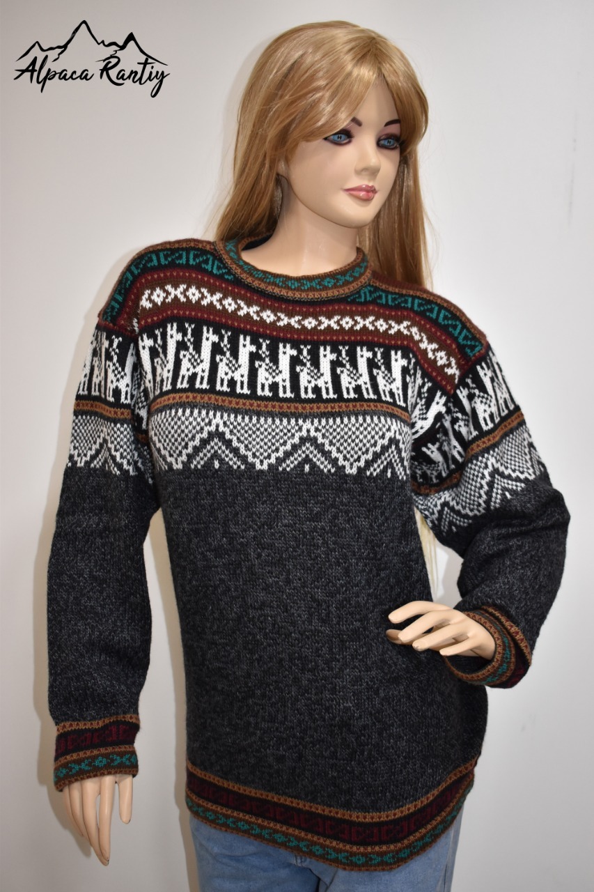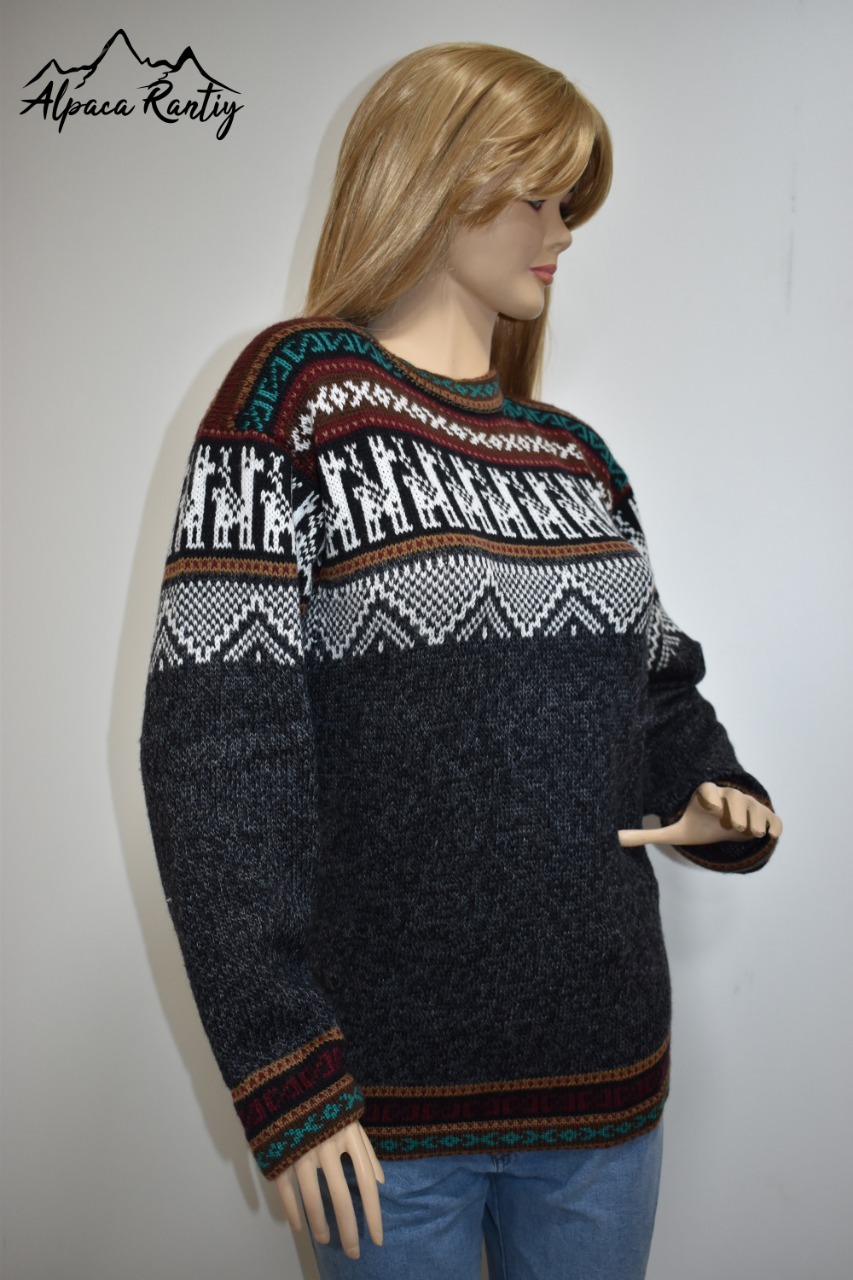 - Diseño Temático de Alpacas: La parte superior del suéter y las mangas presentan una hermosa banda con siluetas estilizadas de alpacas, destacando sobre un fondo negro. Este motivo es un guiño a la procedencia de la fibra y añade un encanto auténtico.