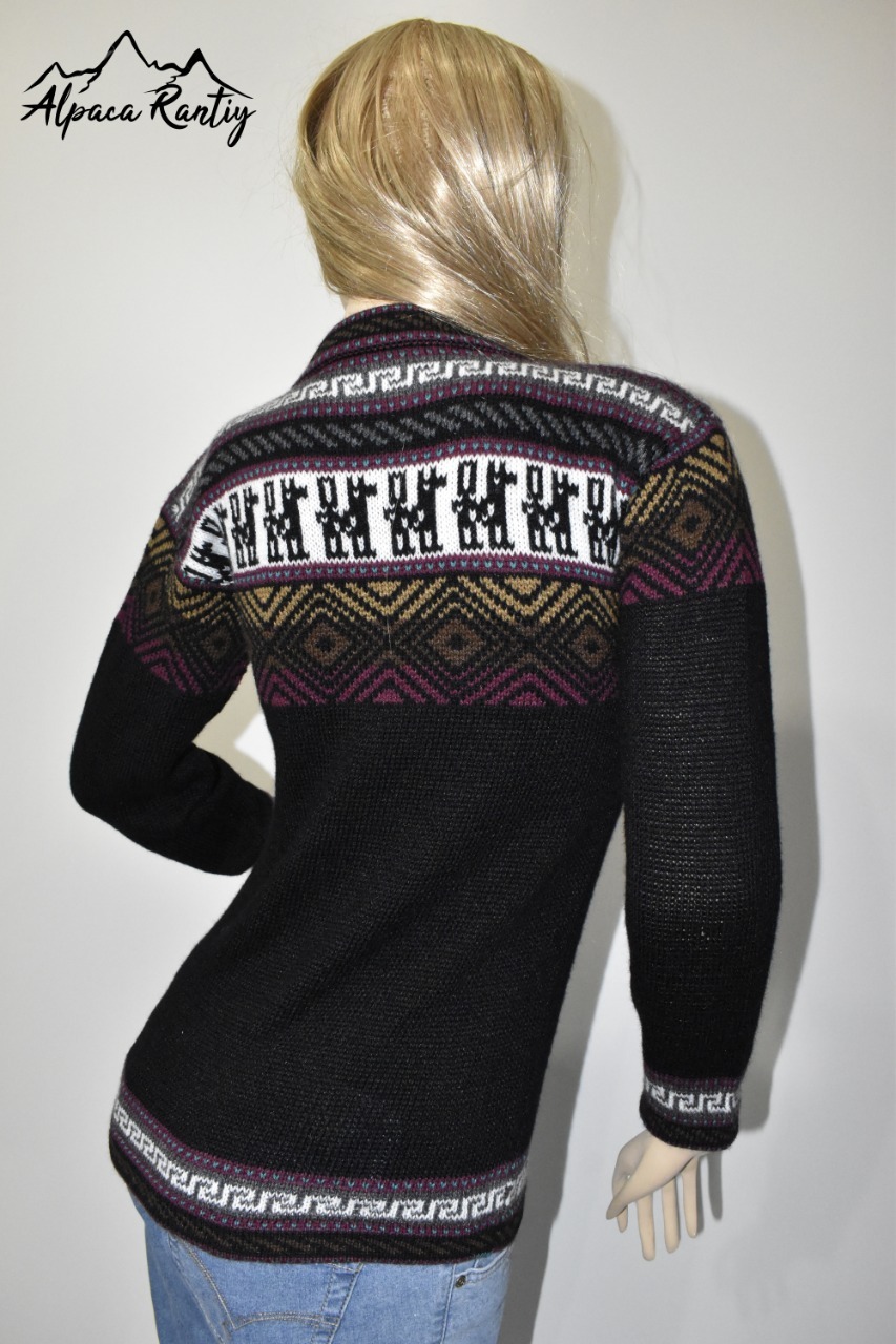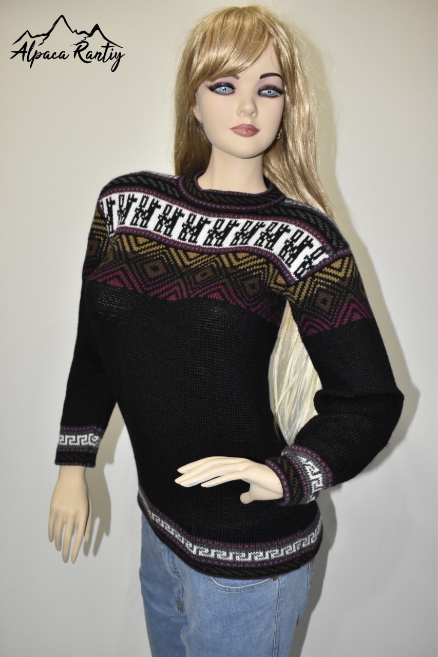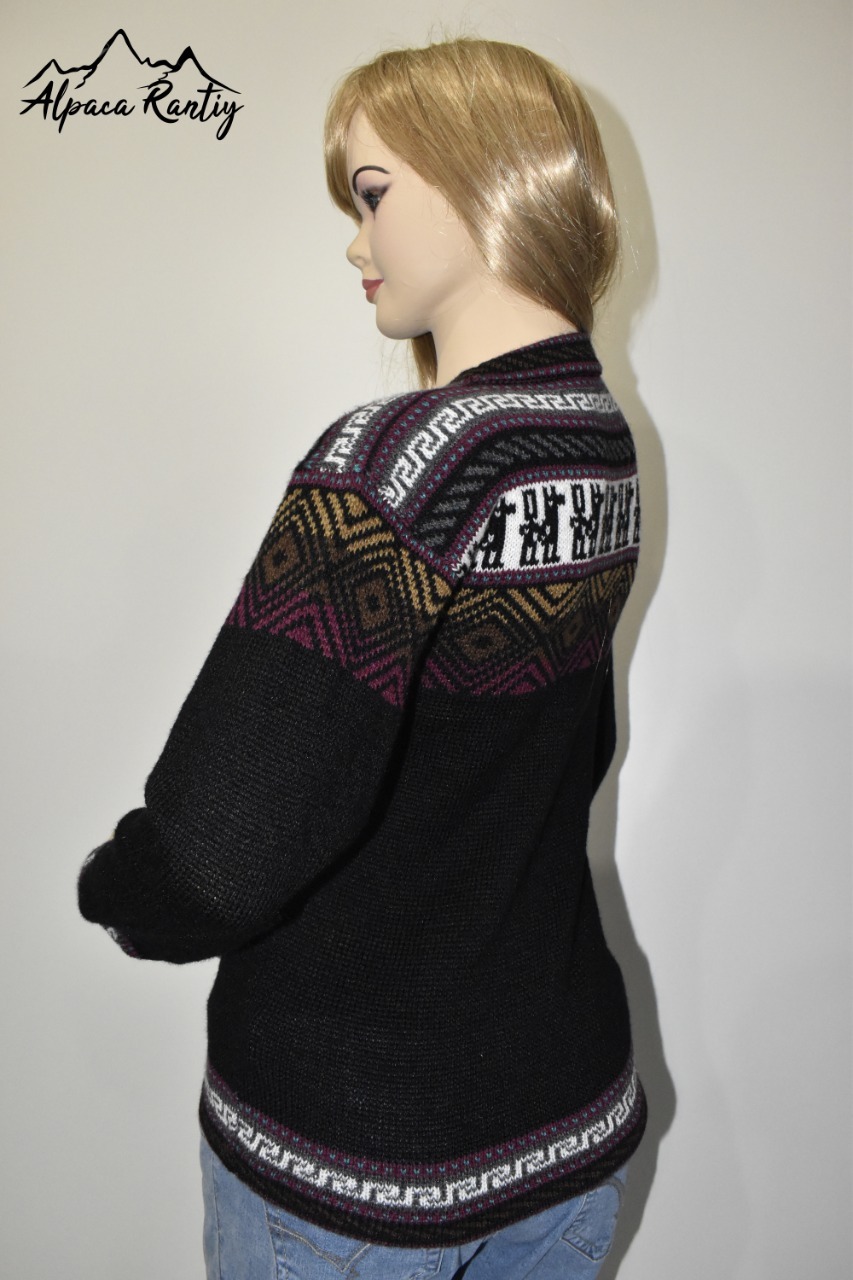 Eleva tu estilo con nuestra elegante chompa de alacril de la marca «Alpaca Rantiykuy». Esta prenda combina la sofisticación del negro con vibrantes y cautivadores patrones inspirados en la rica tradición andina, ofreciendo una pieza única que es tanto cálida como llamativa.