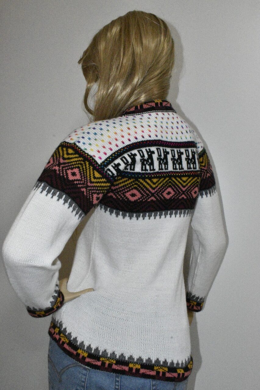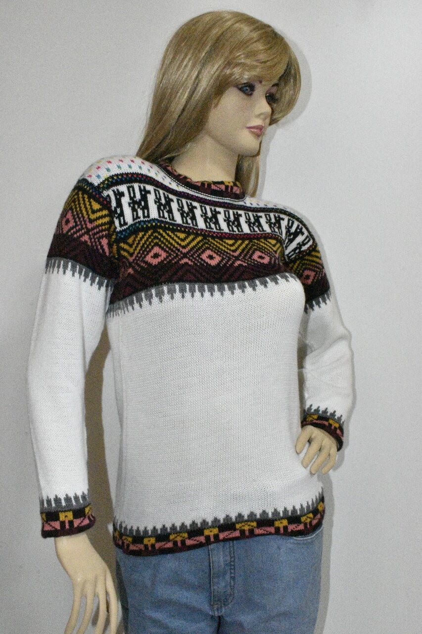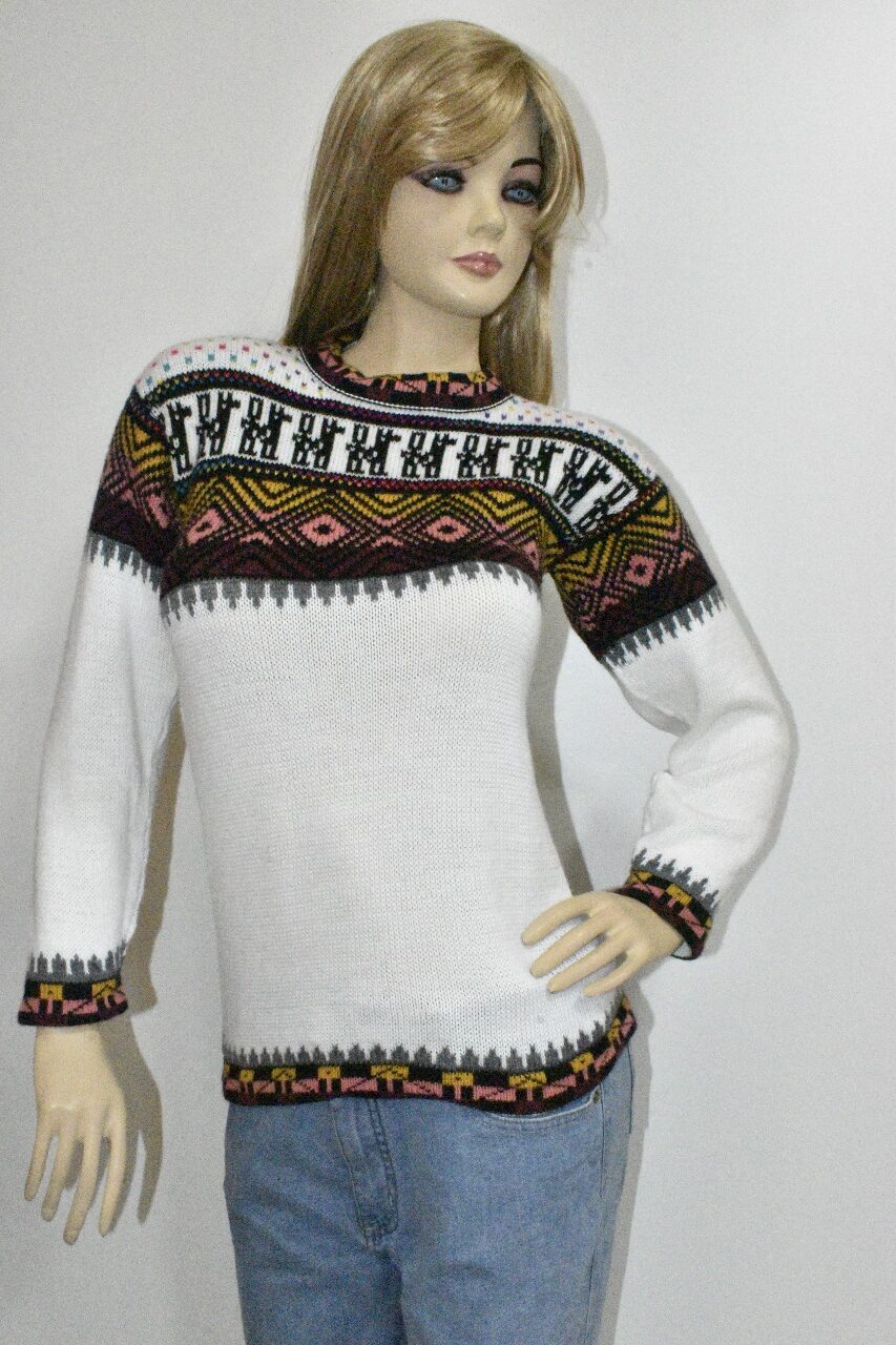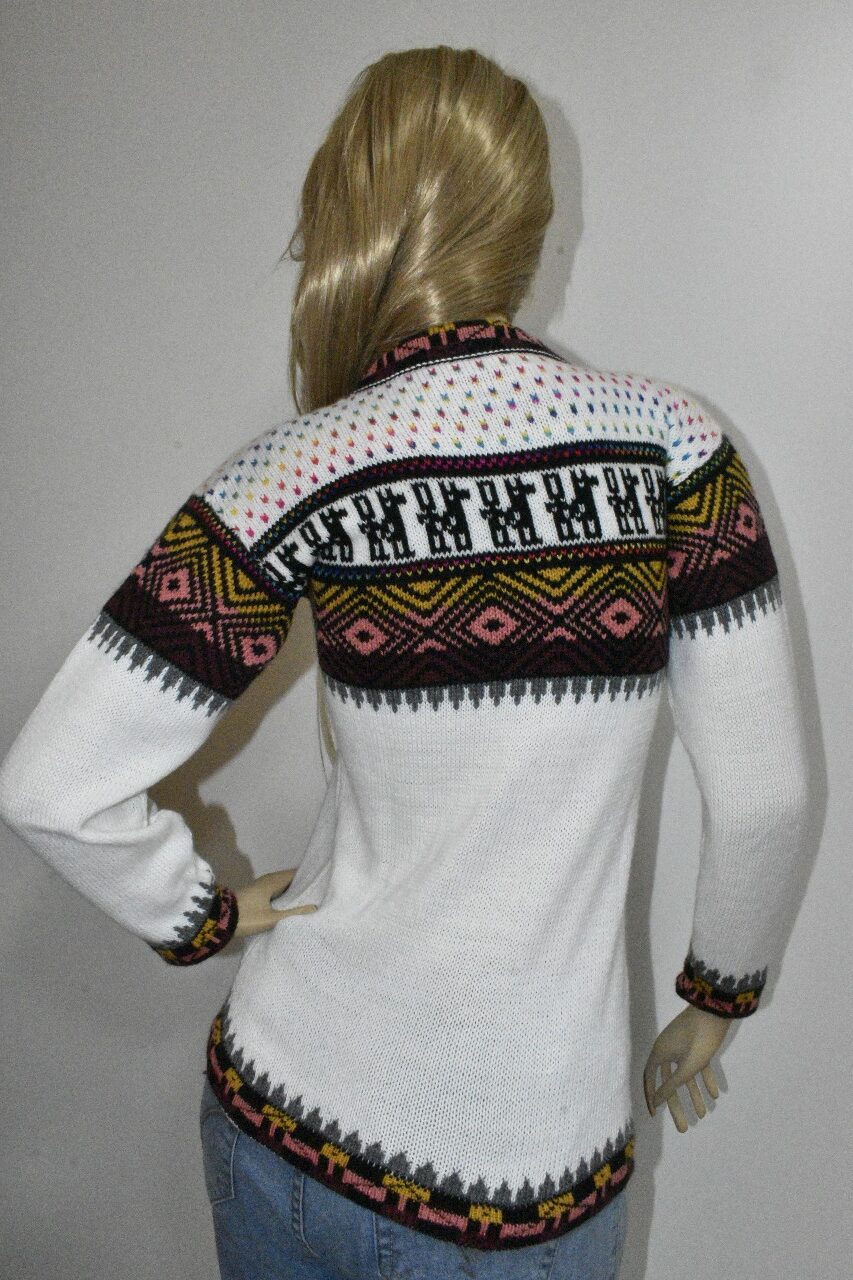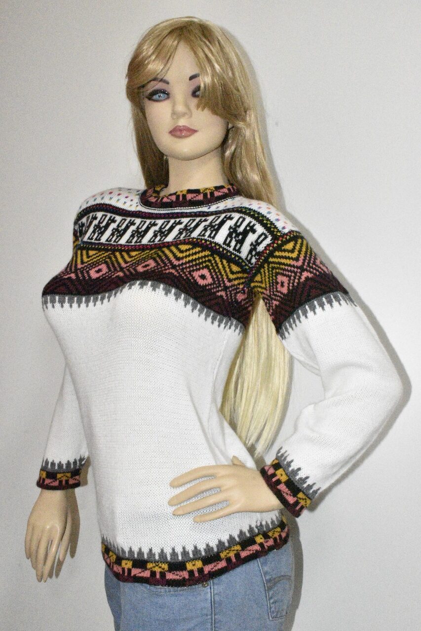 Ilumina tu estilo con nuestra hermosa chompa de alpacril de la marca «Alpaca Rantiykuy». Esta prenda combina la pureza del blanco con vibrantes y cautivadores patrones inspirados en la rica tradición andina y elementos nórdicos, ofreciendo una pieza única que es tanto cálida como distintiva.