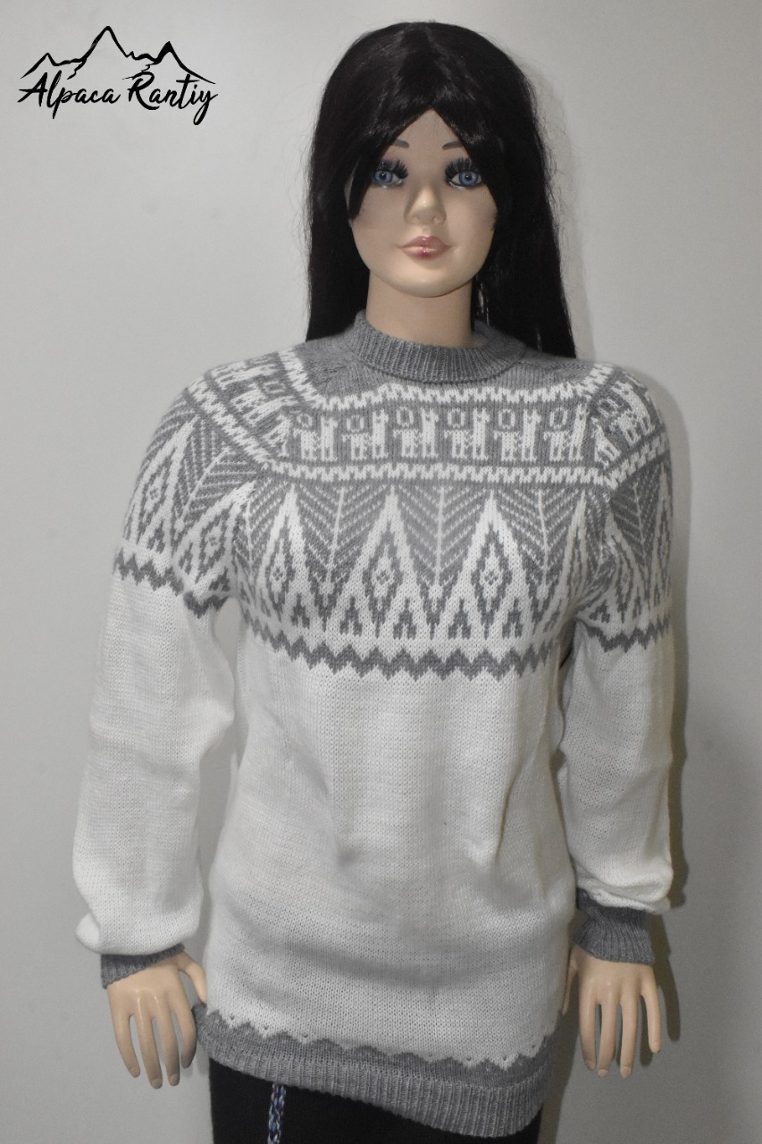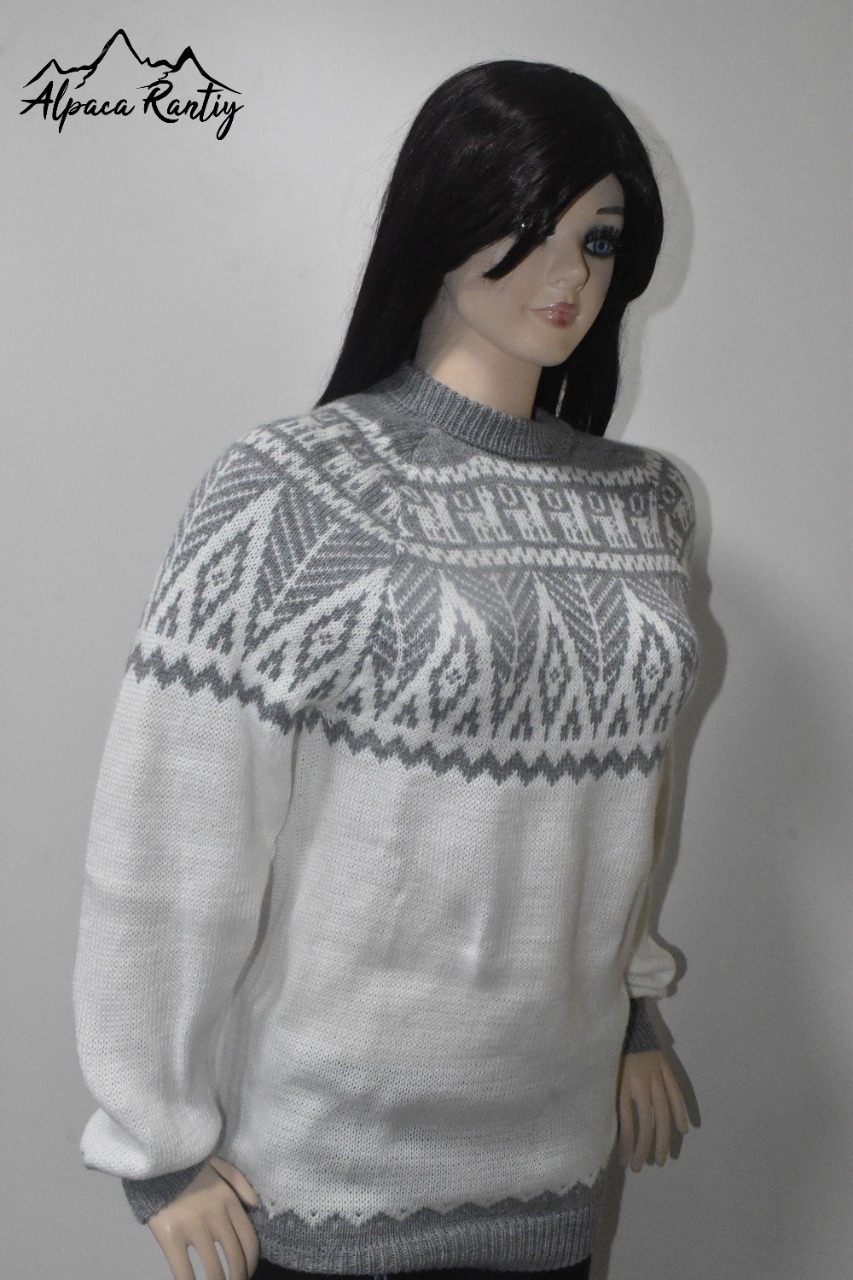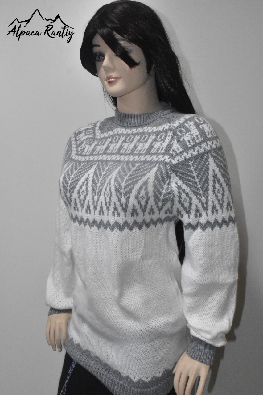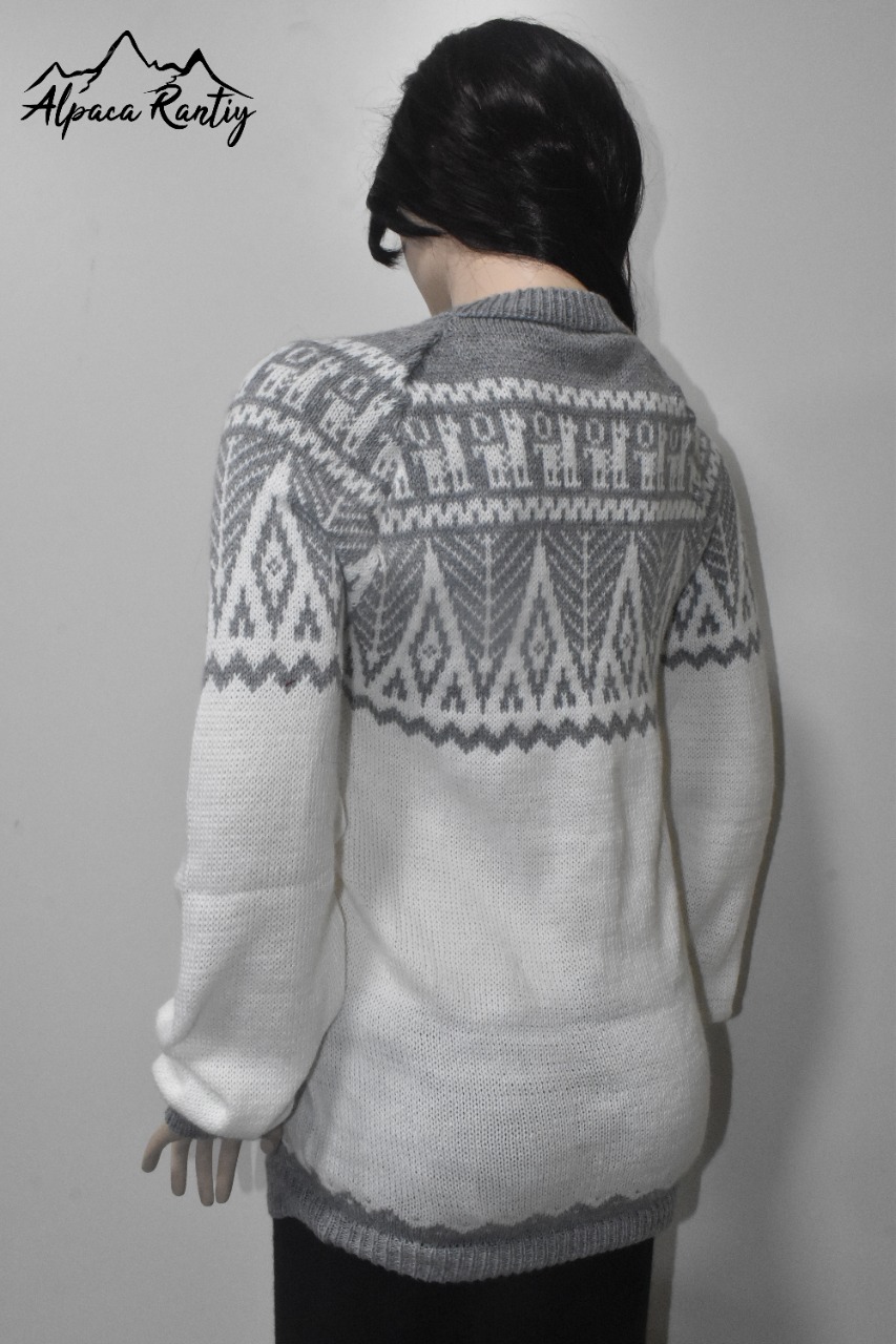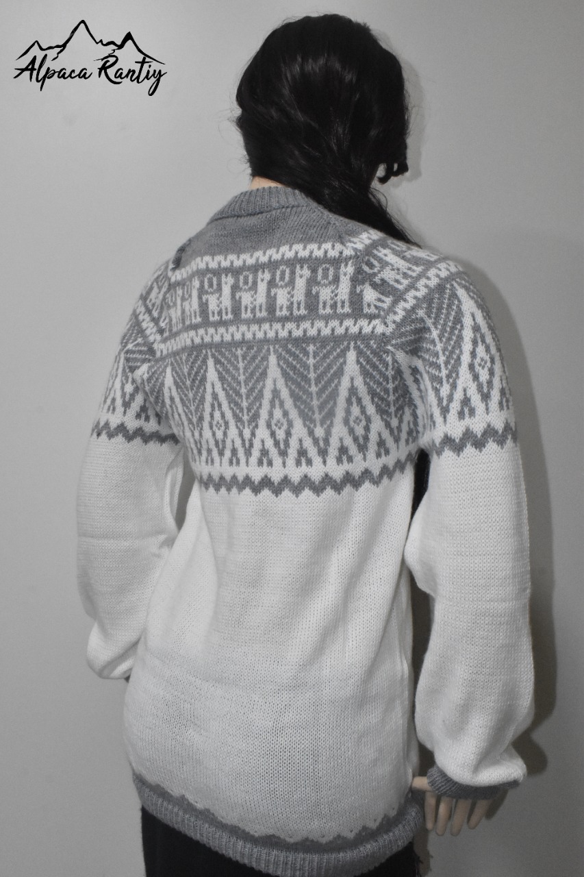 Descubre la combinación perfecta de estilo y confort con esta hermosa chompa de alpacril de la marca «Alpaca Rantiykuy». Su diseño bicolor en tonos neutros y sus patrones intrincados la convierten en una prenda versátil y sofisticada, ideal para cualquier ocasión.