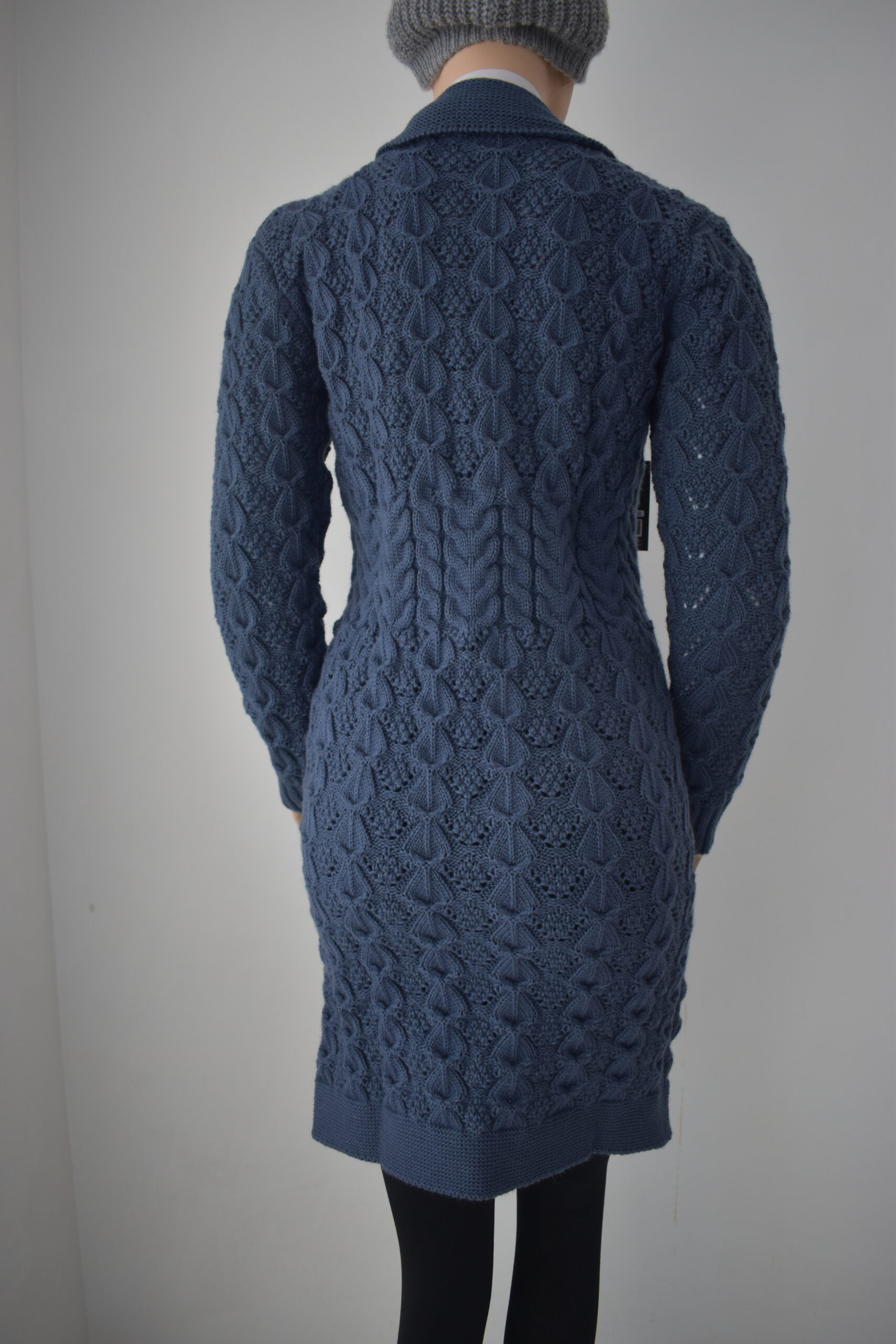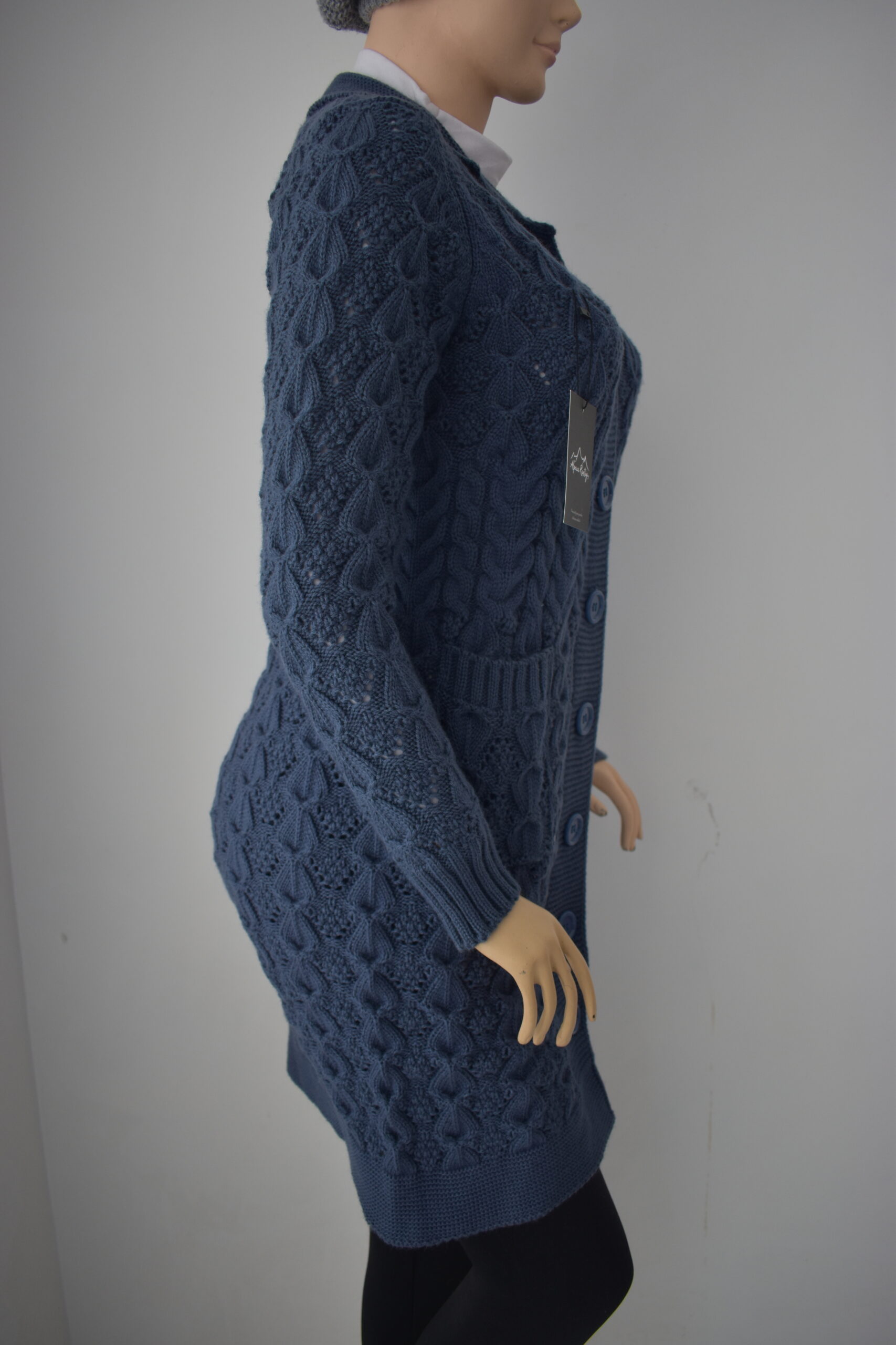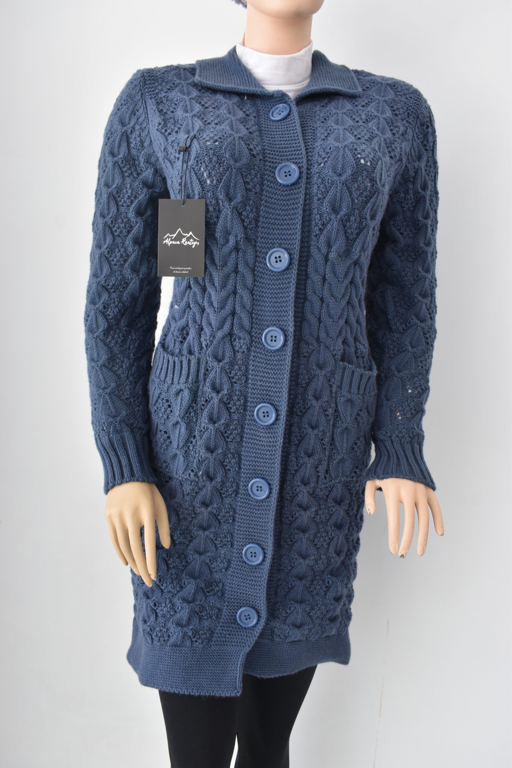 Esta prenda es una Chompa de mujer elaborado con un diseño detallado de punto trenzado y calado. El color es un tono, que aporta calidez y elegancia. Está confeccionado en una fibra gruesa que proporciona abrigo, ideal para climas fríos.