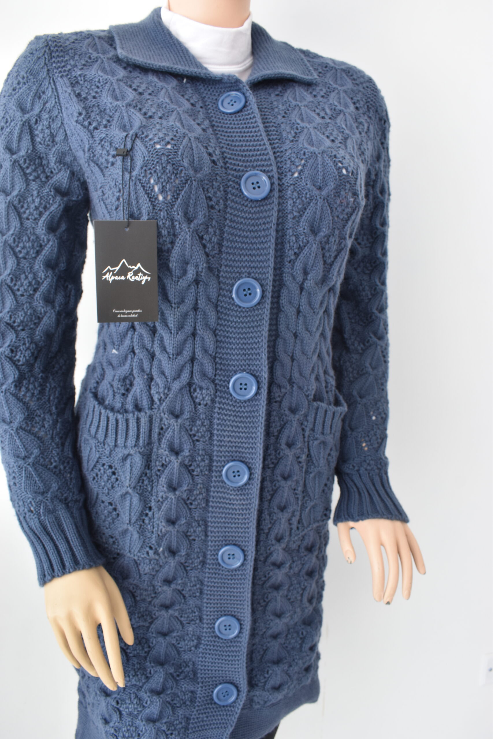 Diseño de punto trenzado en toda la prenda, que le da textura y un acabado artesanal.