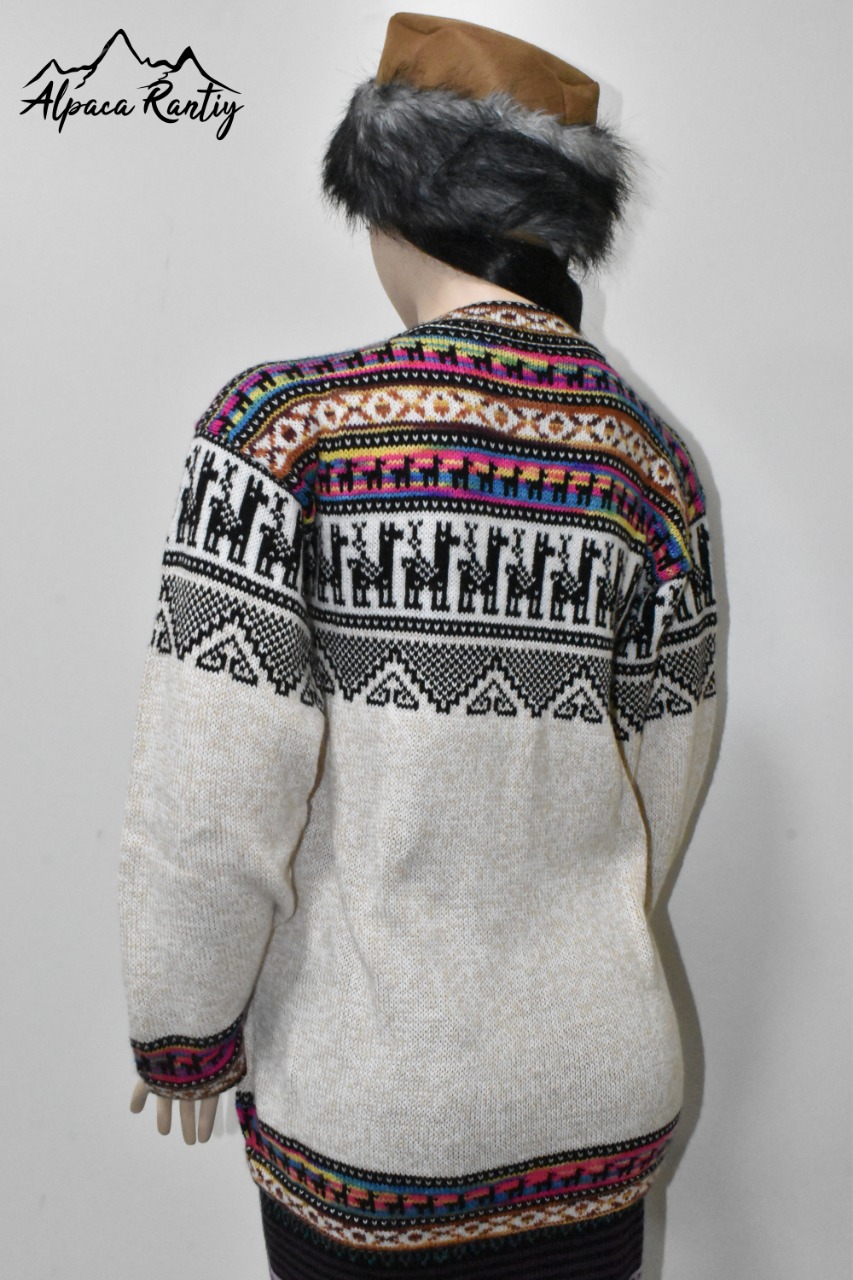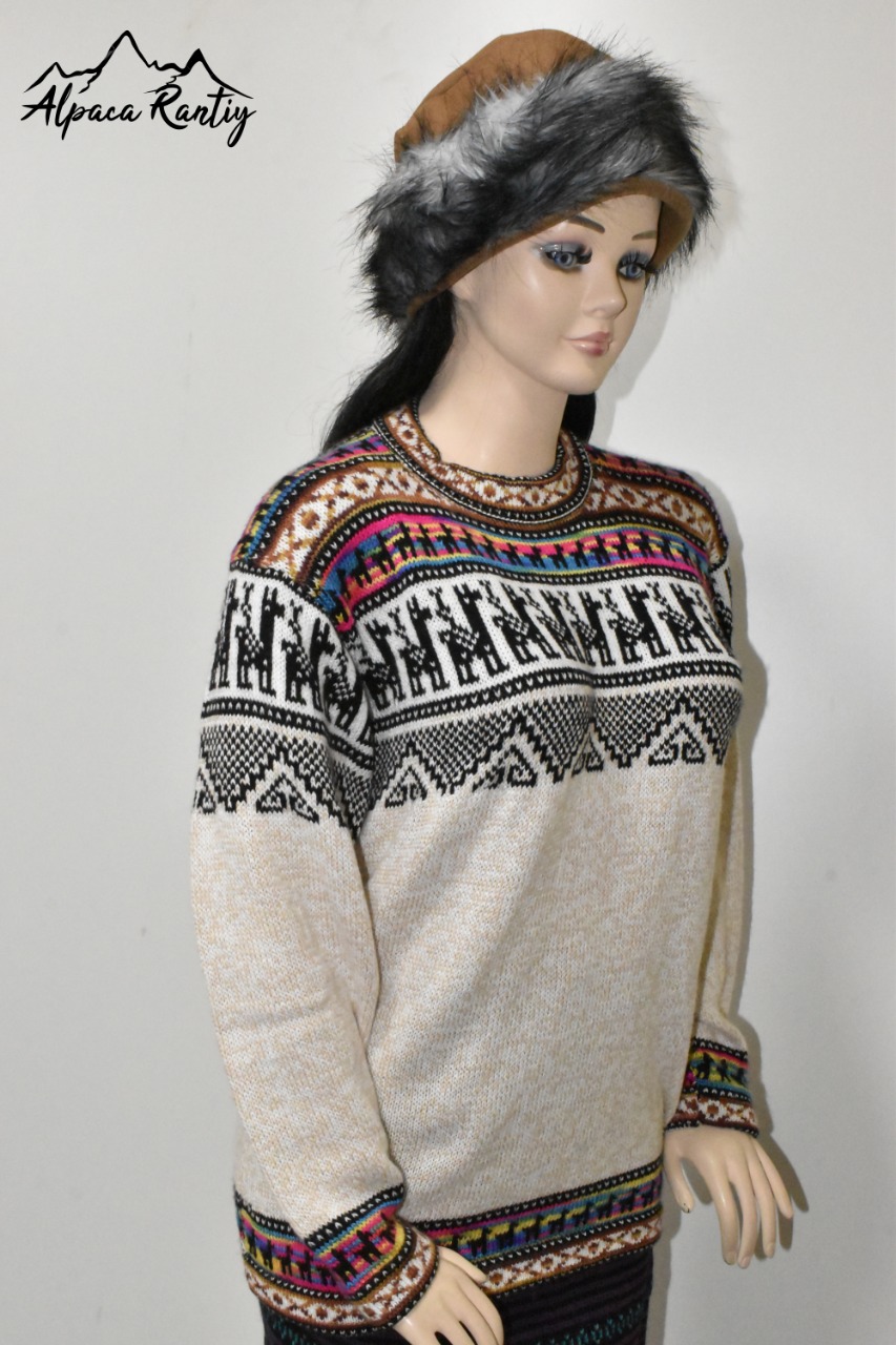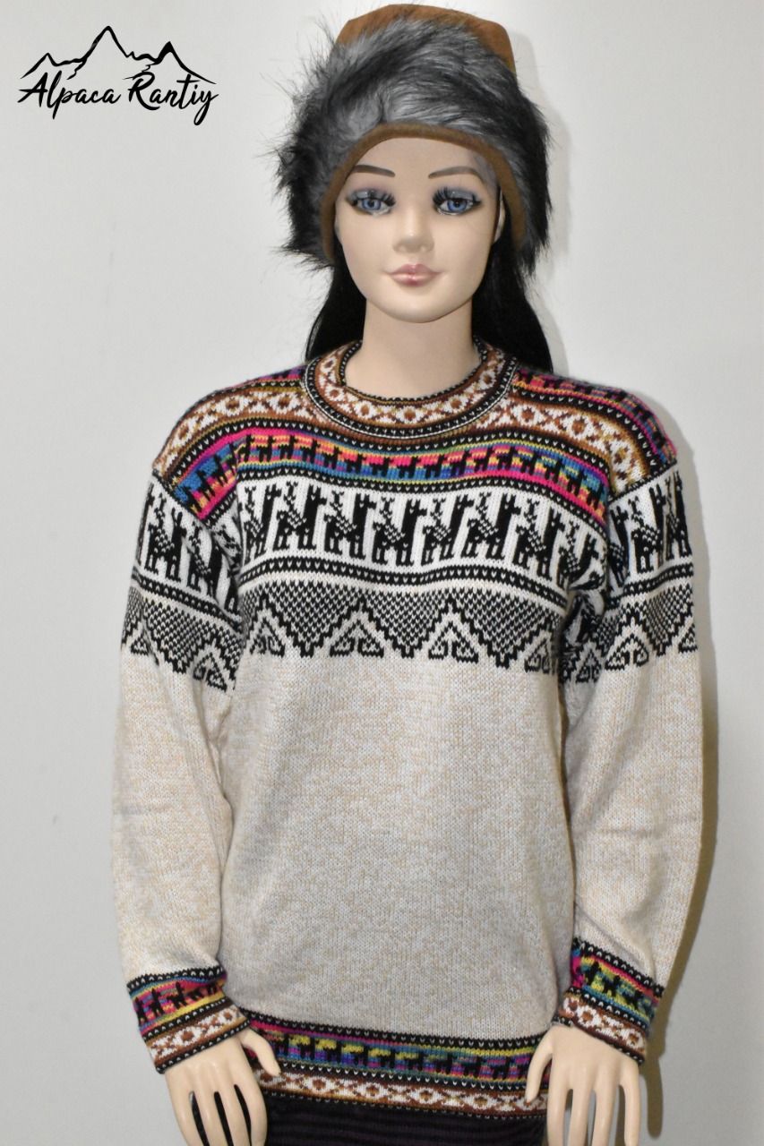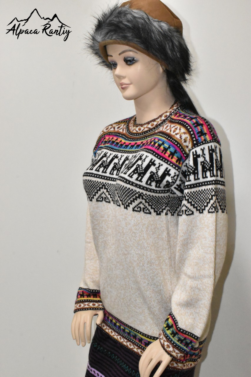 Prepárate para destacar con este vibrante y cálido suéter de la reconocida marca «Alpaca Rantiy». Diseñado para quienes buscan una prenda que combine la riqueza cultural de los Andes con la suavidad y el confort incomparables de la lana de alpaca.